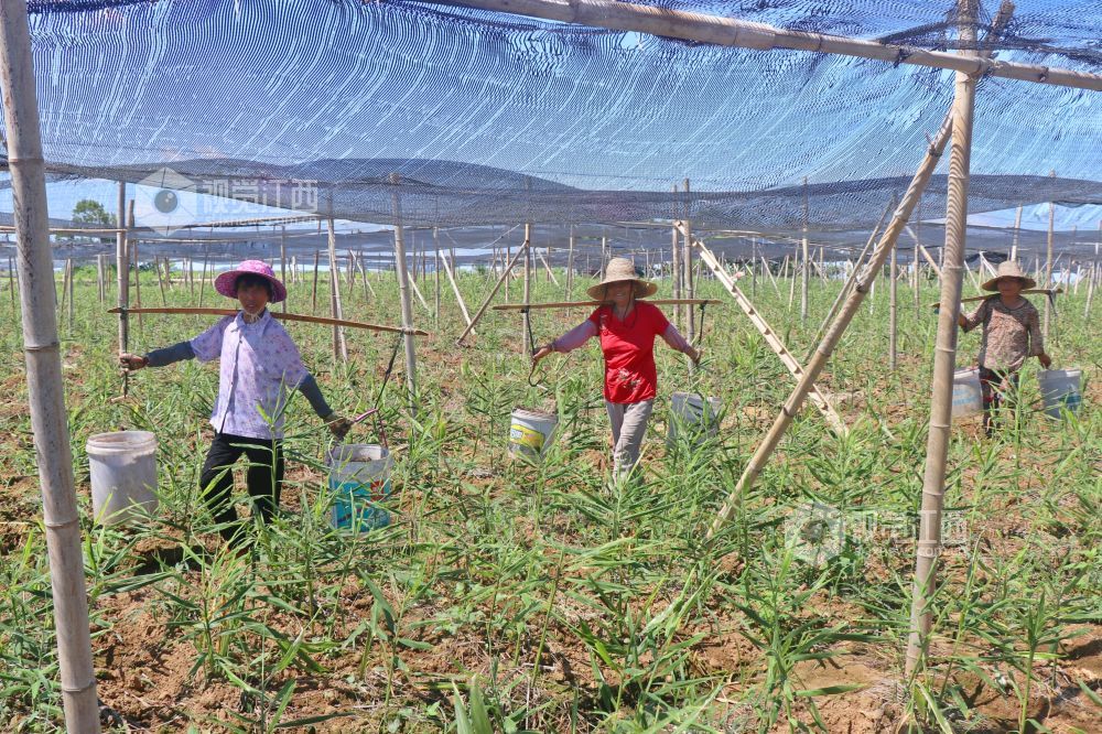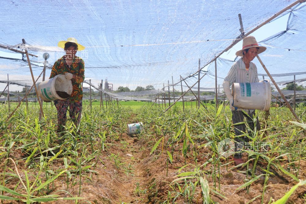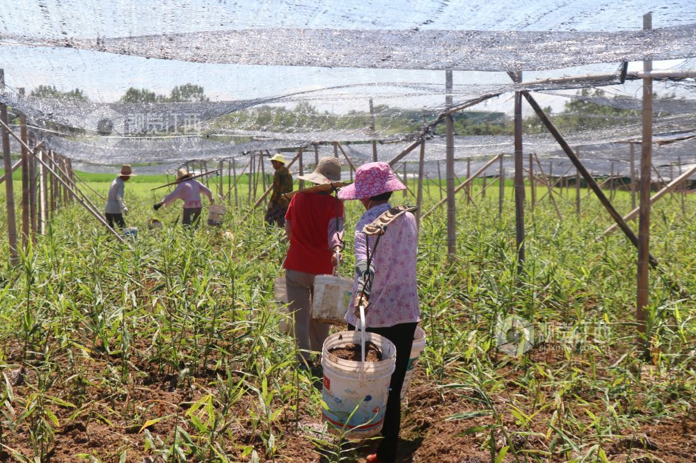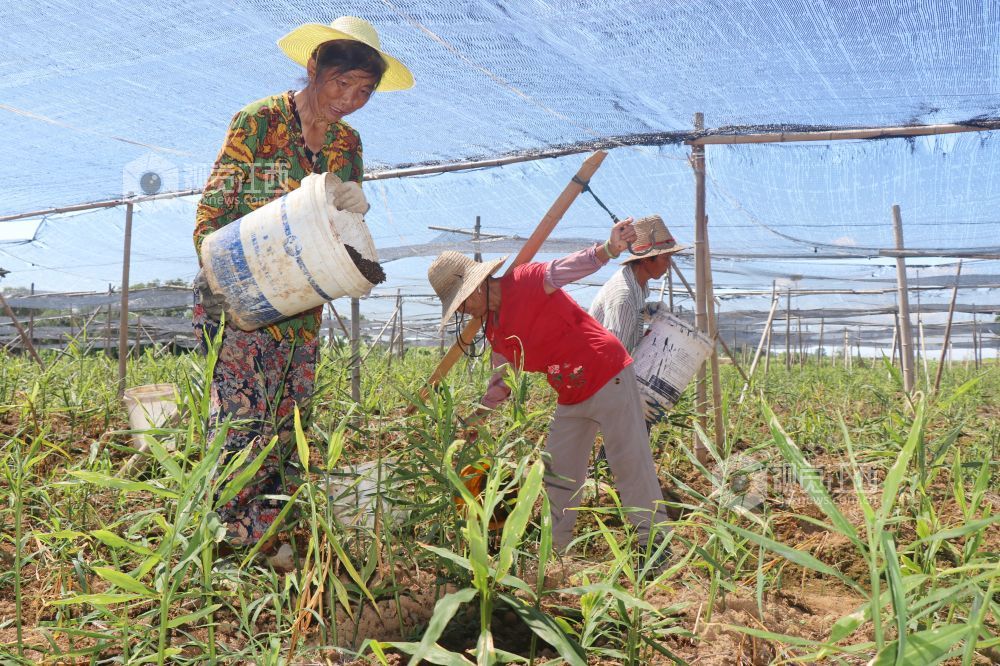 2024年8月2日,江西省余干县康山垦殖场里溪村农民为生姜追肥。江西省余干县康山垦殖场里溪村的生姜陆续进入生长关键期,姜农们抢抓农时进行追肥、浇水、覆土等管理,田间地头一片繁忙景象。