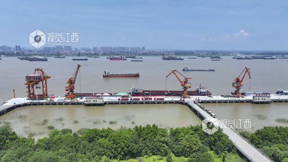 2024年8月7日,江西省九江港瑞昌港区公用码头,一派繁忙的装卸货物场景。