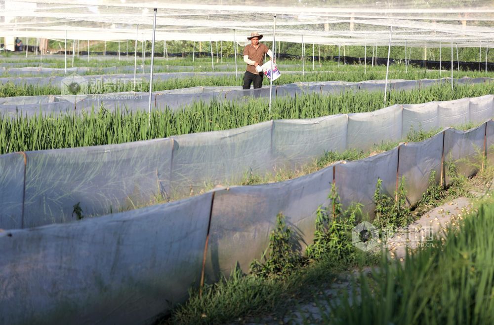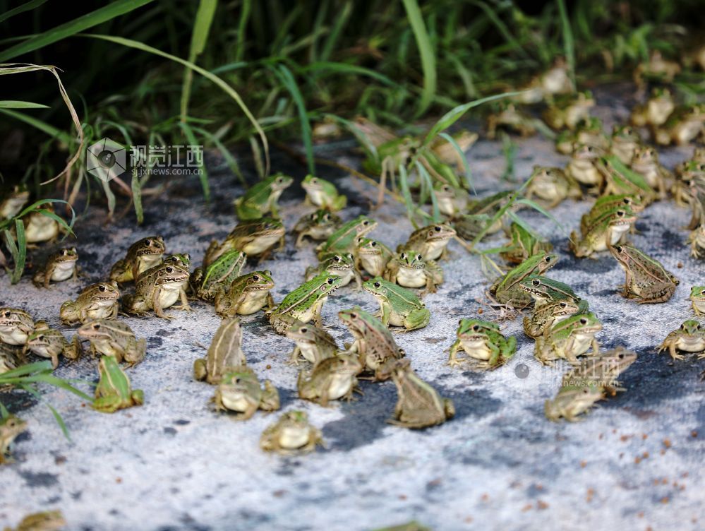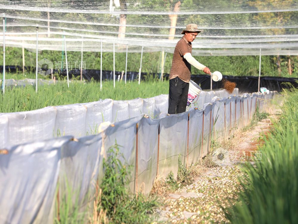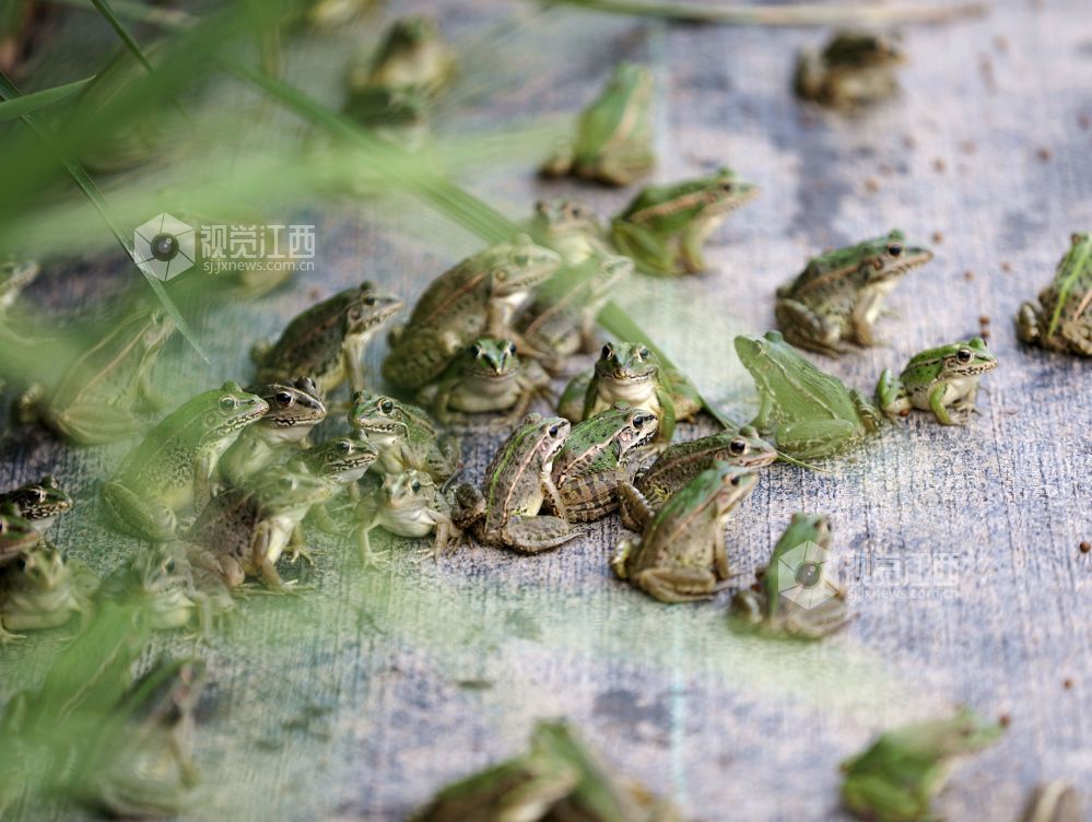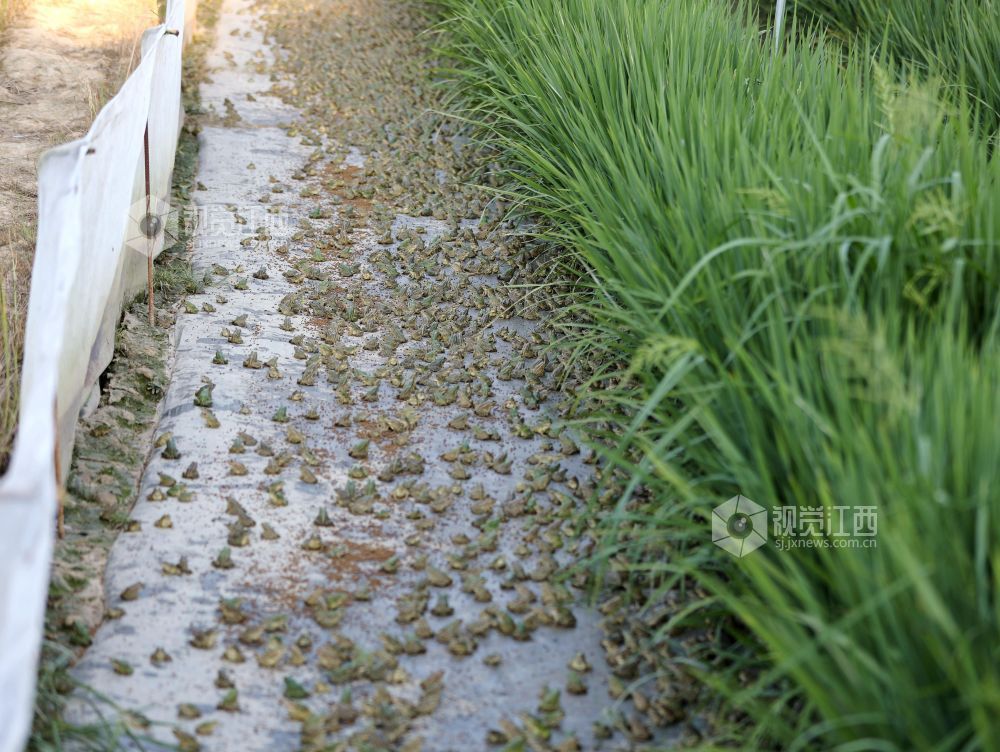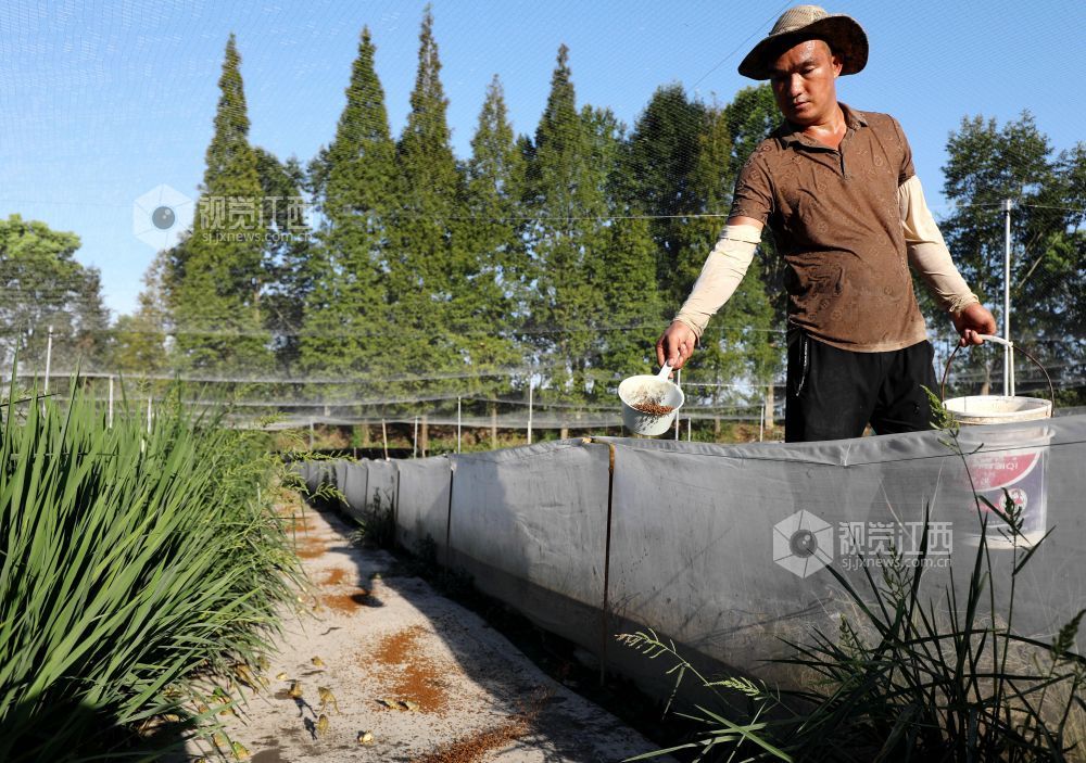 2024年8月7日,江西省分宜县杨桥镇西田村稻蛙种养基地,农户正在给稻蛙投喂食料。近年来,杨桥镇引进稻蛙立体种养模式,实现水稻种植与黑斑蛙养殖的良性循环,促进农民增产增收,助力乡村振兴。