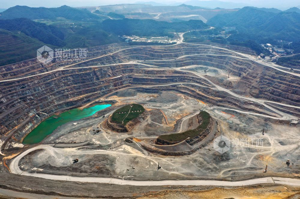 8月7日,俯瞰江西省德兴市德兴铜矿露天采矿场,一派繁忙景象。德兴铜矿是亚洲最大的露天铜矿,也是中国最大的在产铜矿,已探明铜矿石储量17.1亿吨。