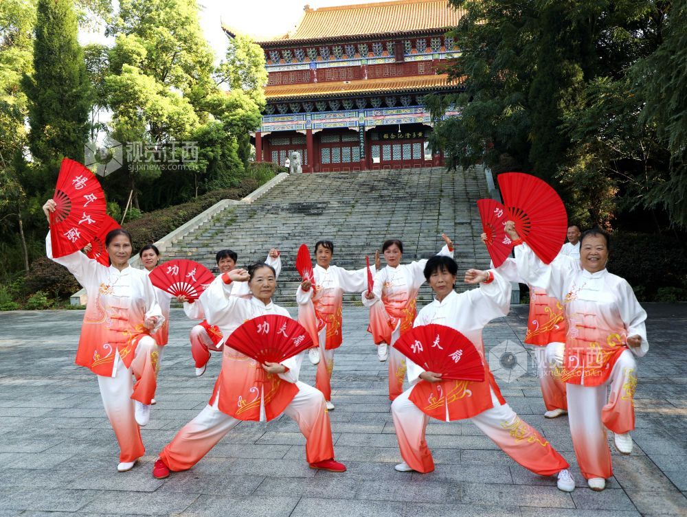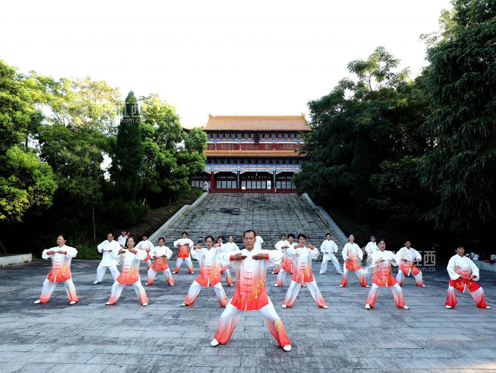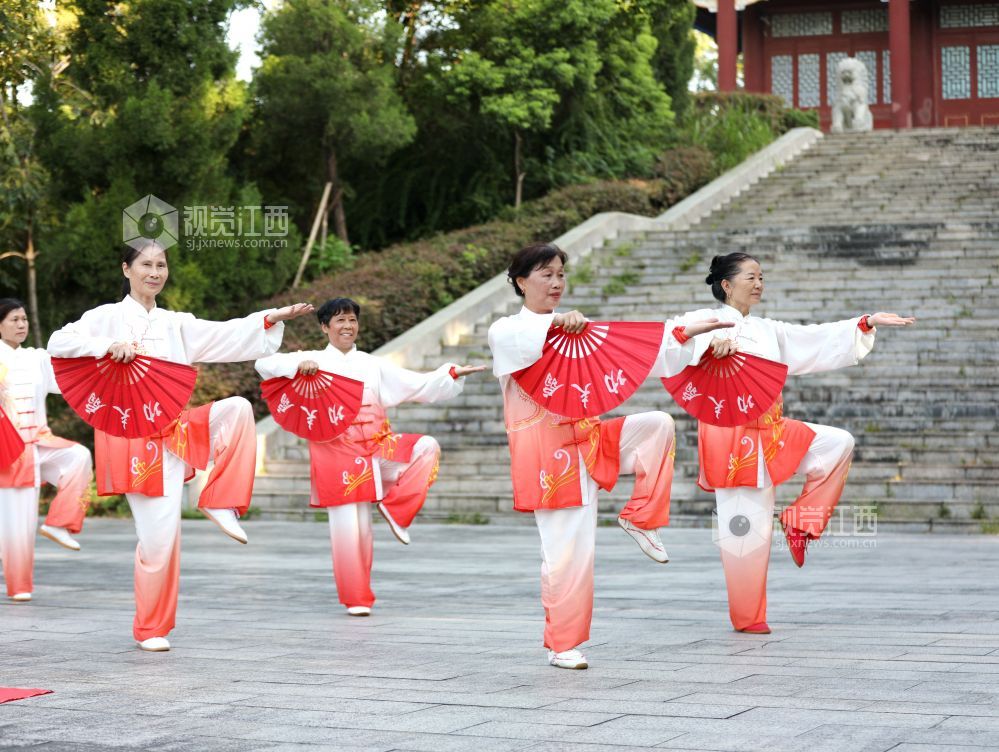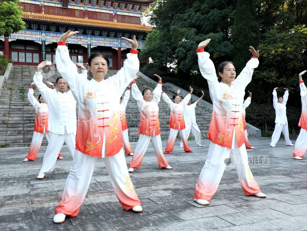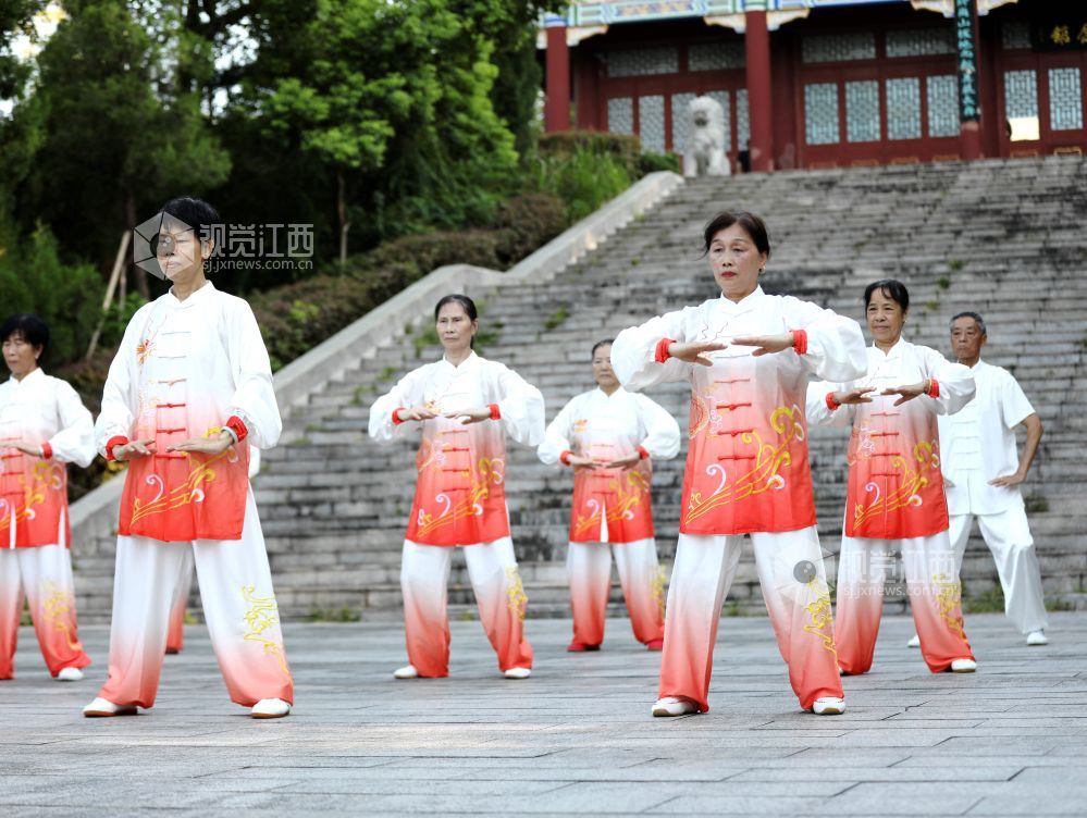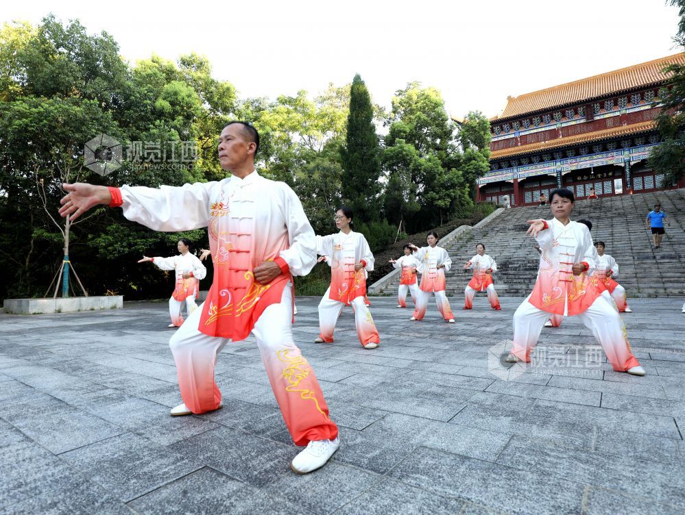 2024年8月8日清晨,气功爱好者在江西省分宜县钤山公园练习健身气功。分宜县钤山公园内绿树成荫、空气清新,许多市民来这里进行户外晨练,在运动中享受乐趣,愉悦心情。