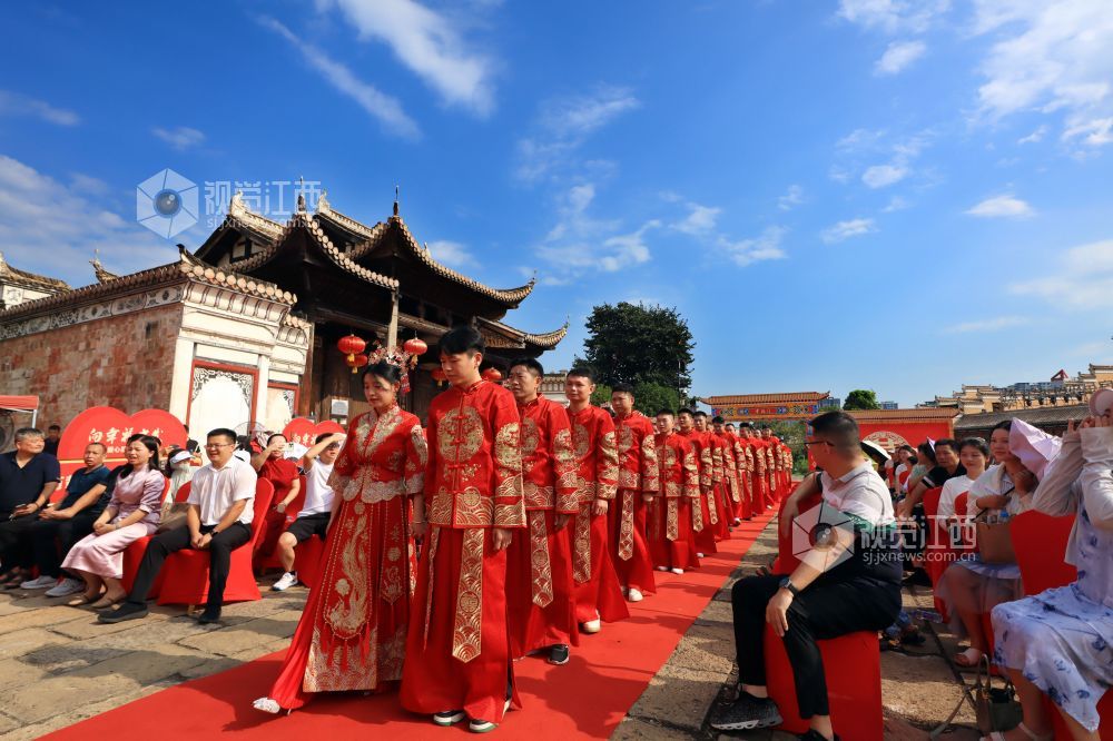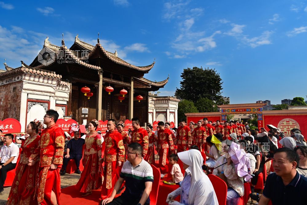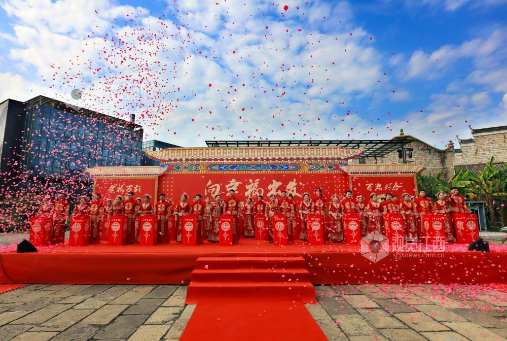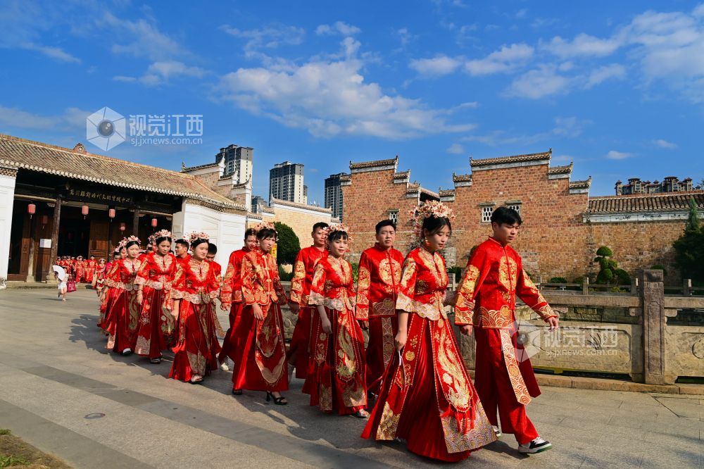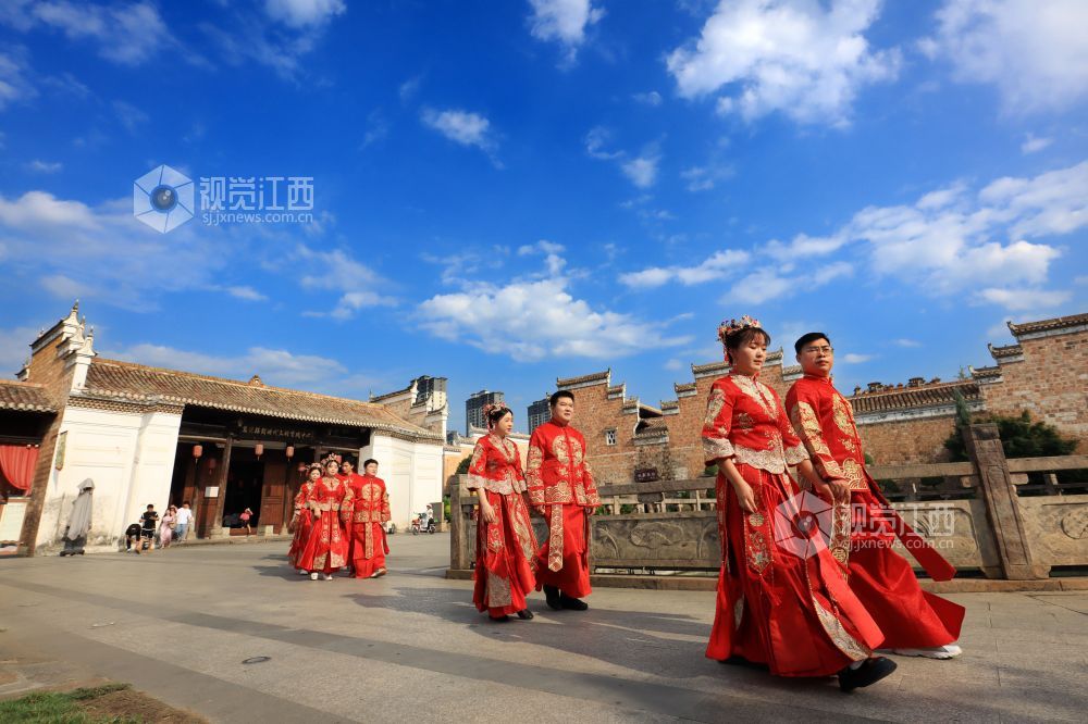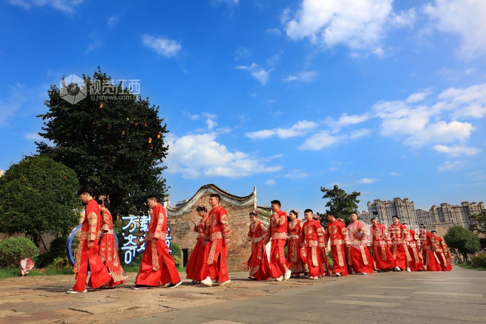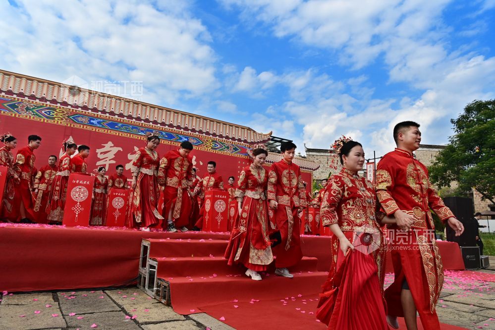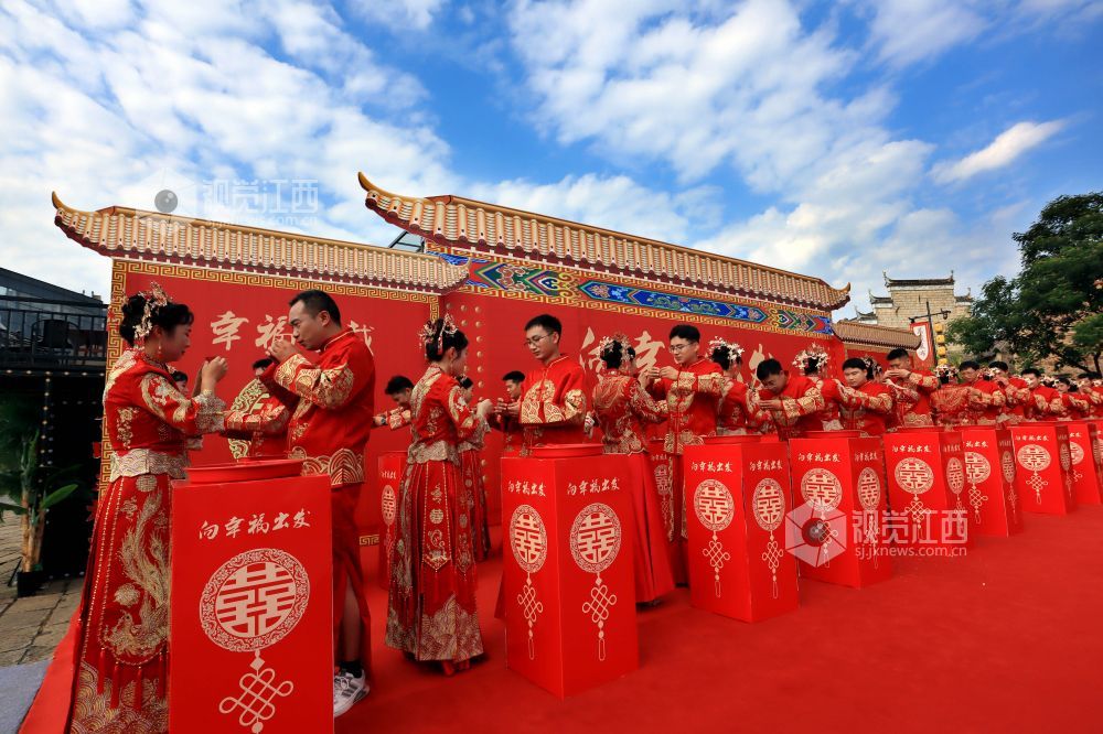 8月10日,江西省宜春市万载县“向幸福出发”崇德尚俭为爱减负移风易俗倡新风 “七夕”集体婚礼在万载古城绿荫公祠广场举行,25对新人穿戴传统婚礼服饰,通过巡游古城、拜堂、喝交杯酒、宣读文明婚礼誓言等仪式,引导年轻人树立婚事新办、喜事简办、移风易俗新观念,努力营造节俭办婚、勤俭持家的文明新风尚。