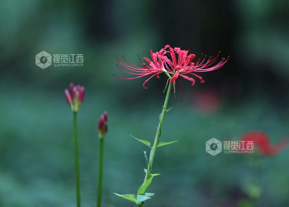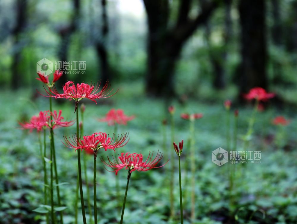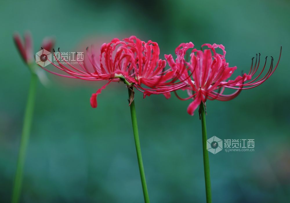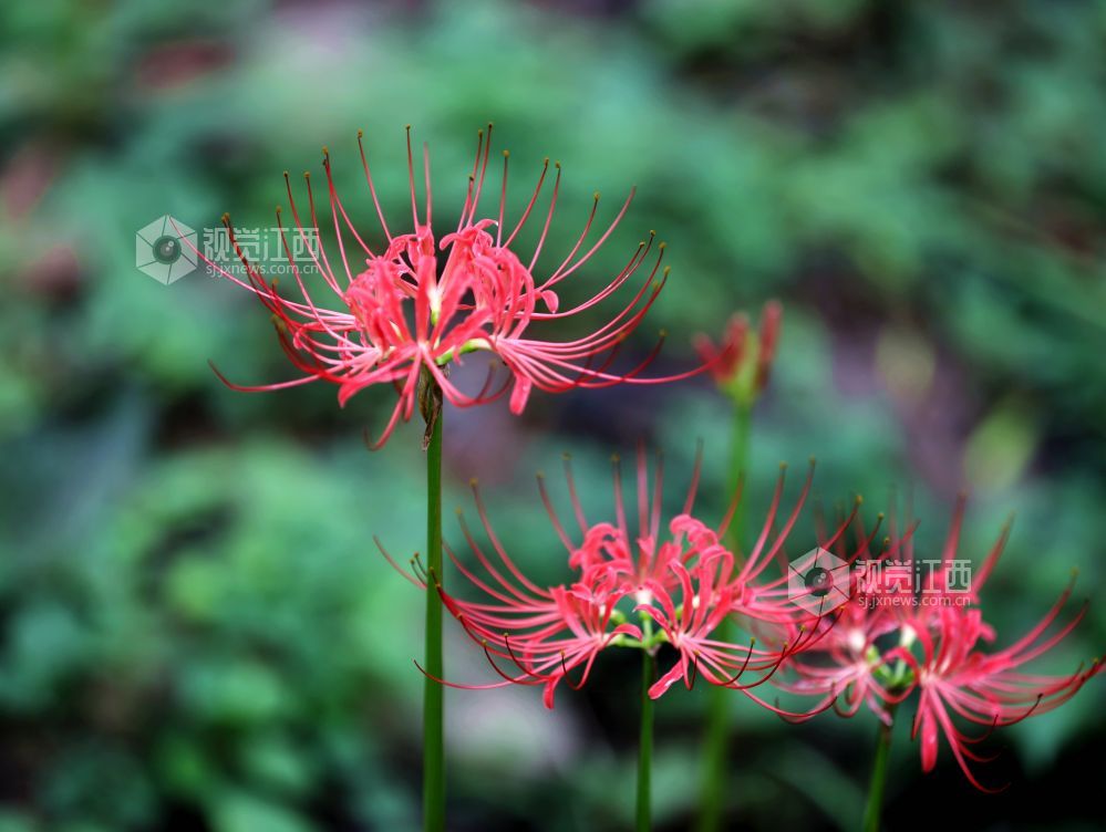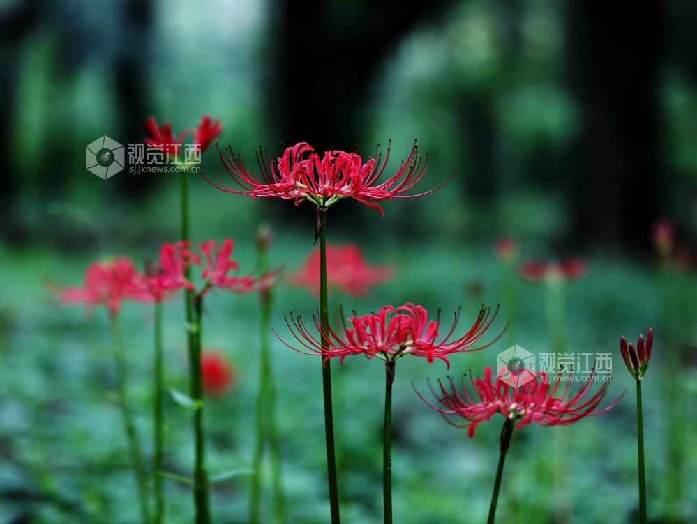 2024年8月30日,位于江西省分宜县境内的中国林科院亚热带实验中心树木园里,曼珠沙华竞相绽放,绚丽多姿,成为早秋时节里的一道美丽风景。生长在枝头的花朵排列如伞,花瓣反卷呈灯笼状,从花瓣中心迸射出长长的蕊丝,好似烟花一般艳丽。据悉,曼珠沙华又名石蒜花、彼岸花,是一种花叶互不相见的观赏植物,花期将持续到9月。