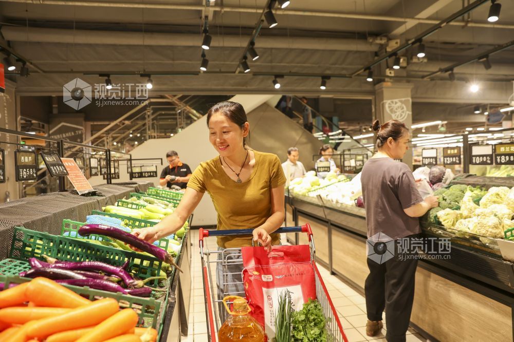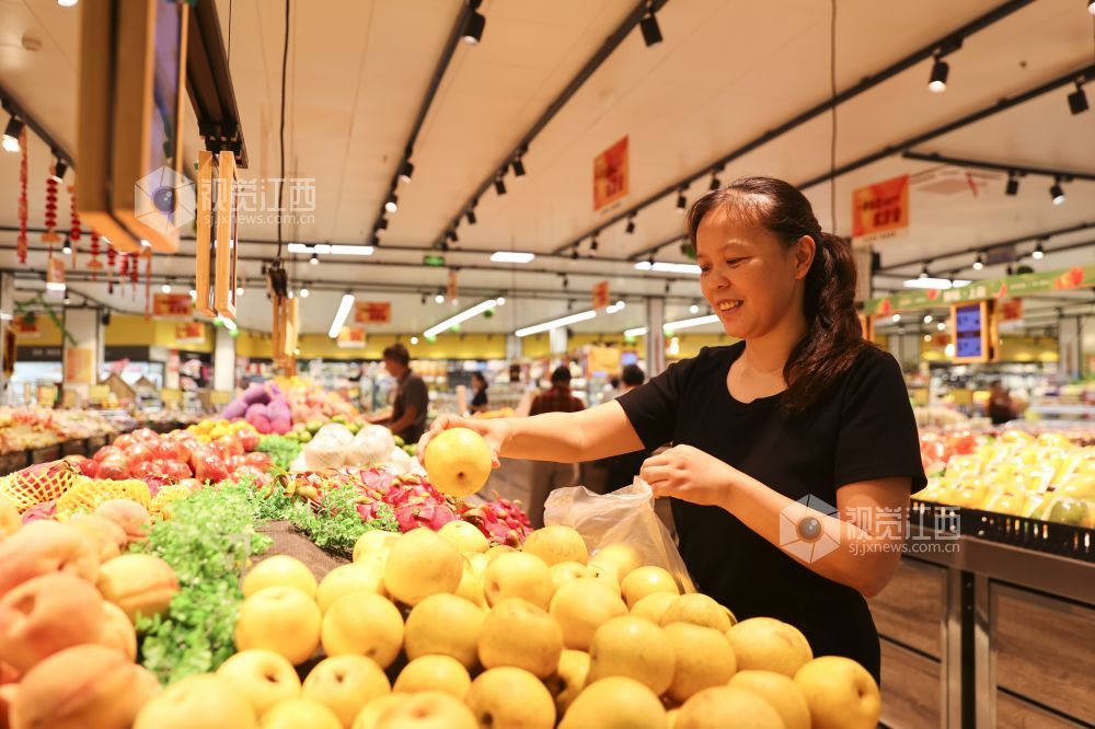 2024年9月13日,江西省瑞昌市城区一家超市内,市民在选购价格平稳的蔬菜、水果等。