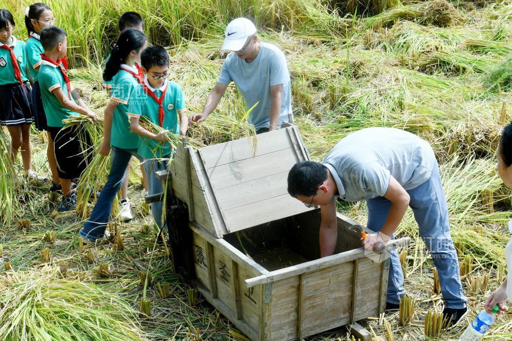 2024年9月13日,江西省德兴市李宅中心小学六年级学生在老师的指导下,正在该校劳动基地现场体验传统打谷机收割稻谷乐趣。