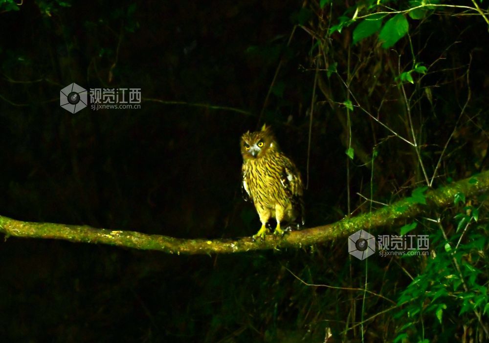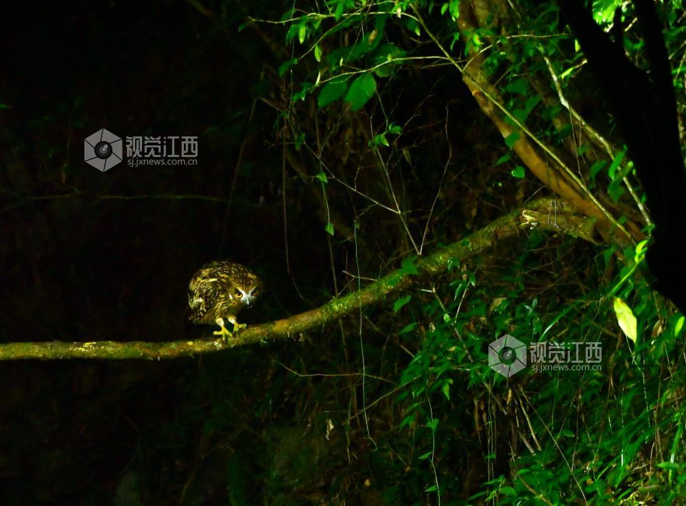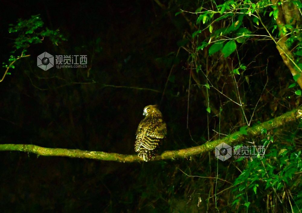 2024年9月21日,在江西九江市武宁县宋溪镇伊山村自然保护区,一只猫头鹰静静地站在树枝上,时而转动着脑袋,观察者四周的猎物。