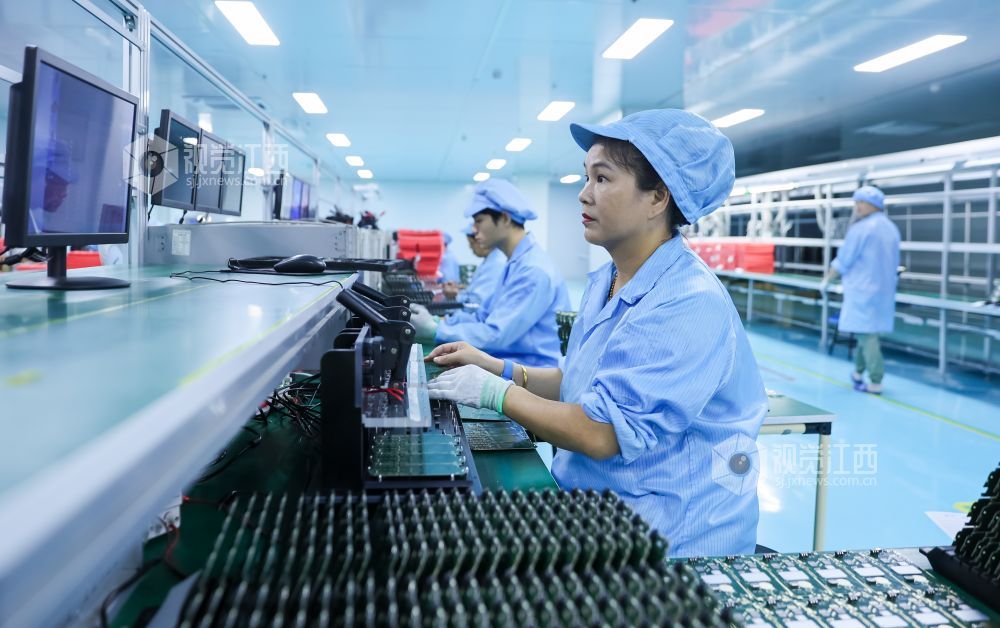 2024年9月26日,江西省瑞昌经开区智造小镇江西丰润电子有限公司生产车间内,工人们正在生产线上赶制手机及新能源汽车PCBA主板。