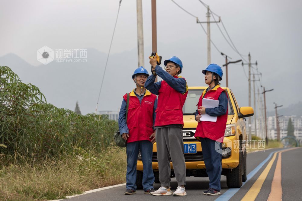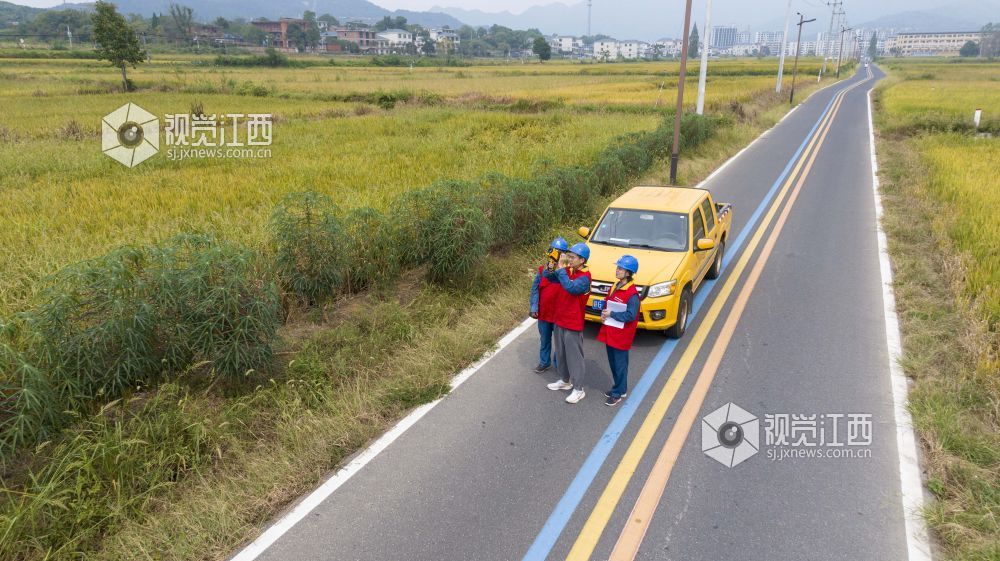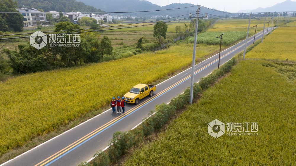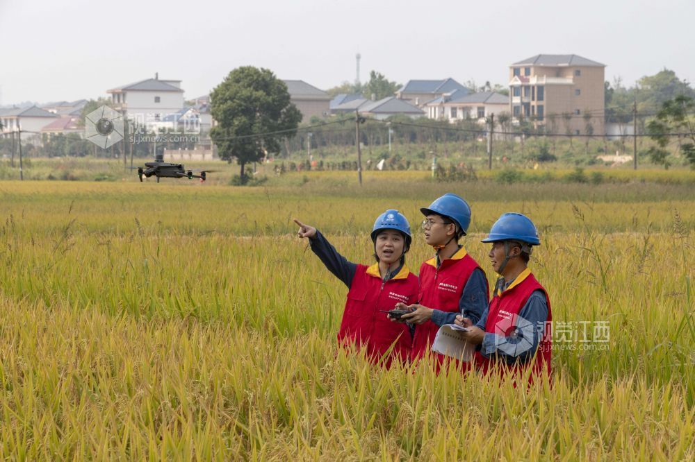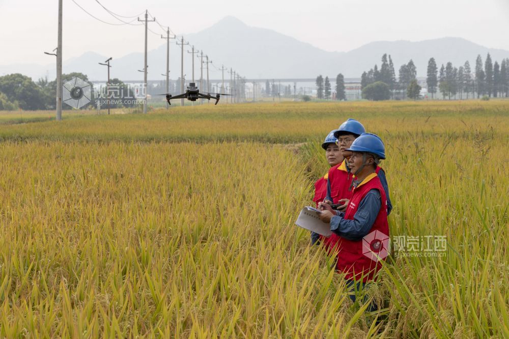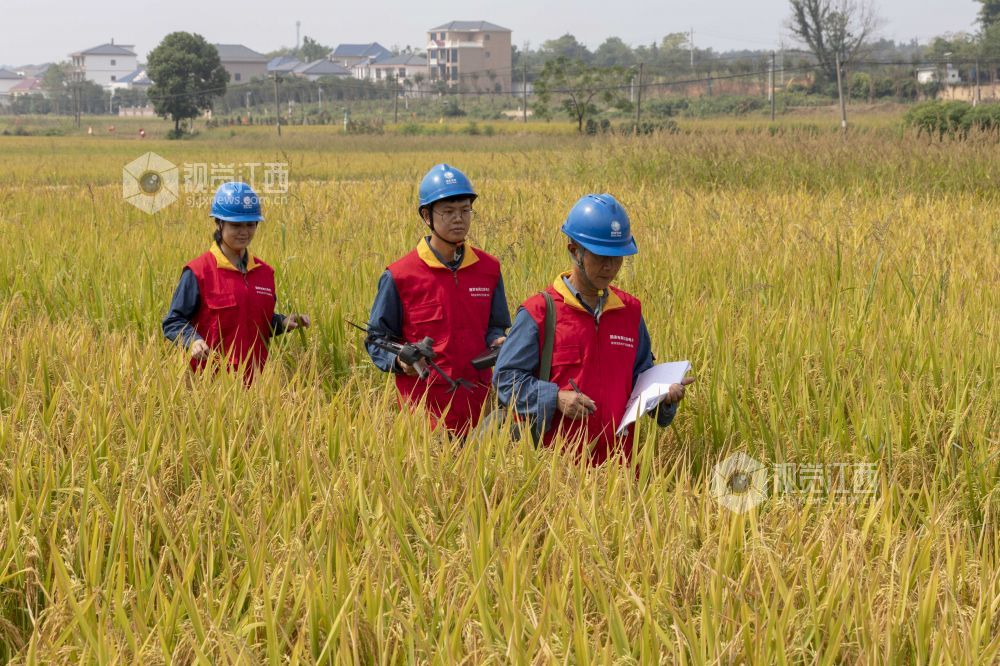 2024年9月27日,在江西省庐山市,国网九江庐山市供电公司温泉供电所组织员工在对隘口村高标农田里的供电线路进行巡检,为夺取粮食丰收做好保障。