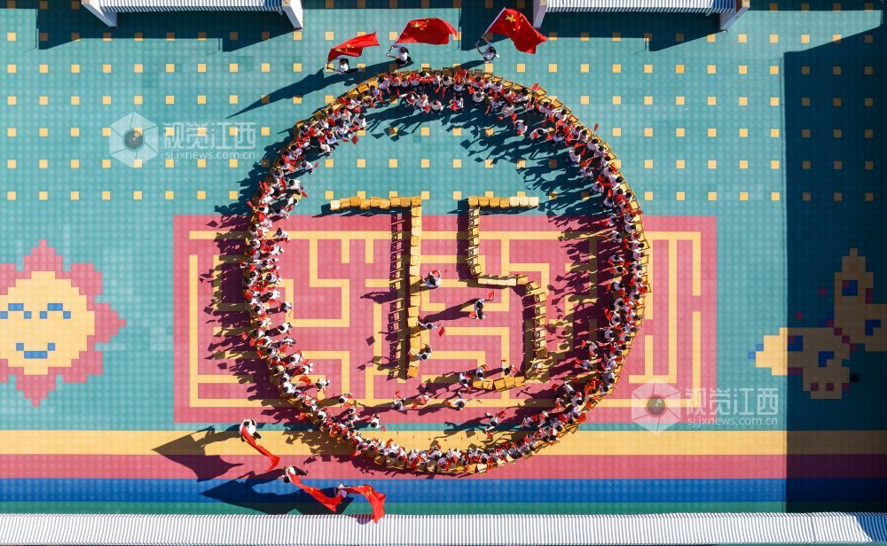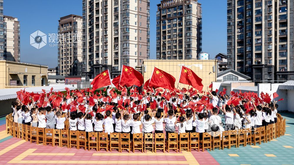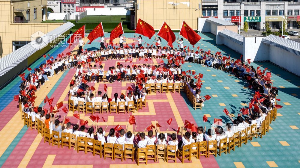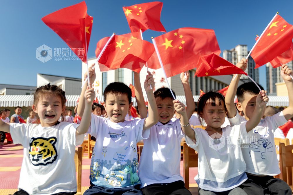 2024年9月29日,江西省吉安市吉水县城南中心幼儿园,小朋友手舞国旗,喜迎国庆,表达对祖国的热爱和祝福。