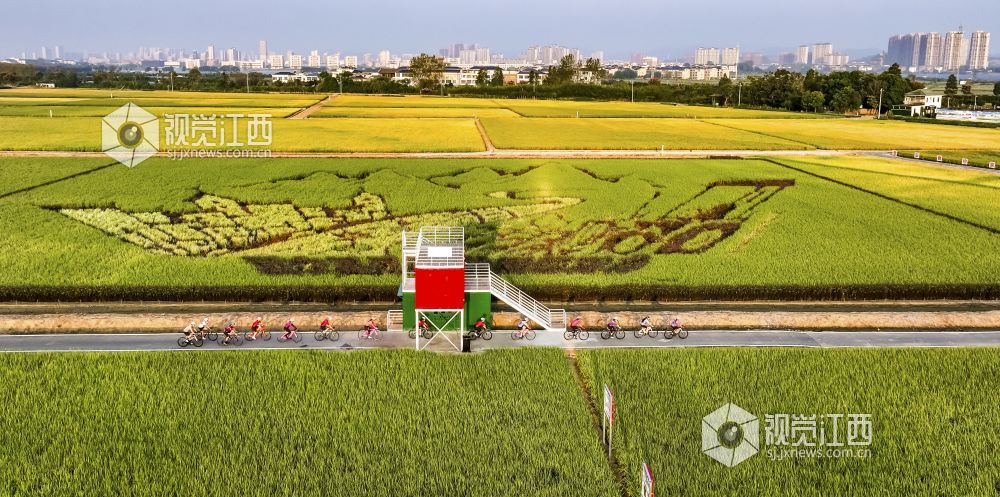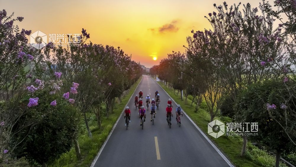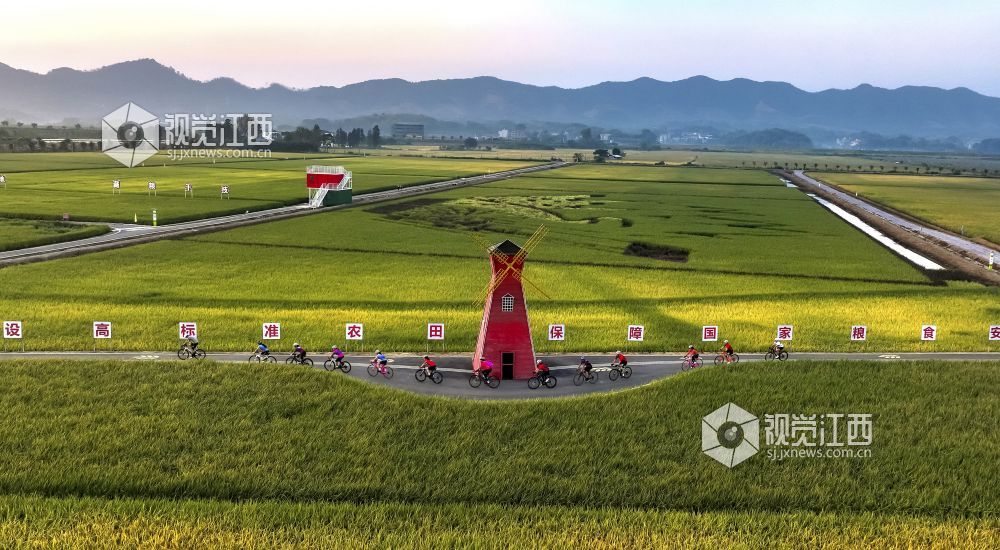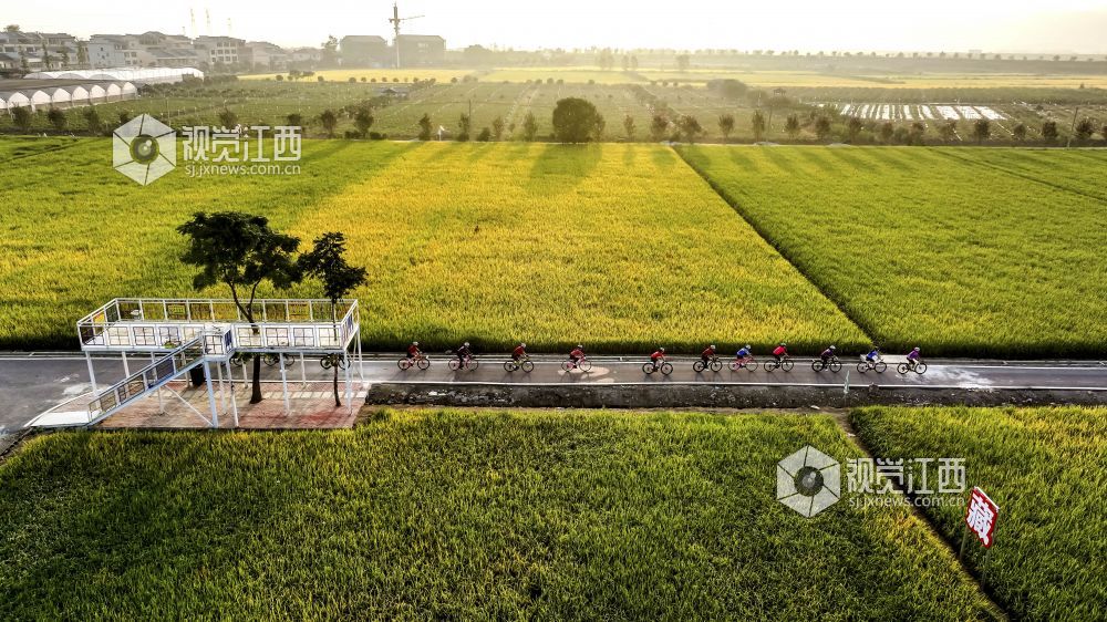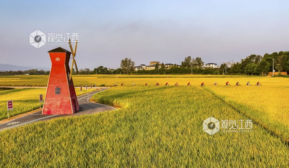 2024年9月29日,江西省瑞昌市赛湖农场螺蛳港,自行车运动爱好者在风景优美的乡村道路上骑行。
