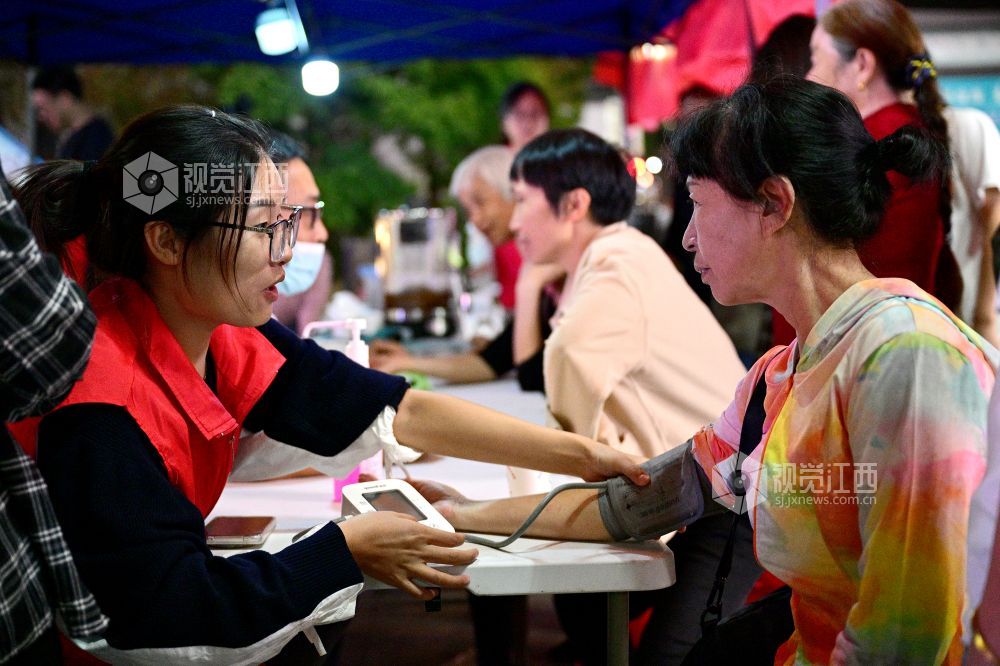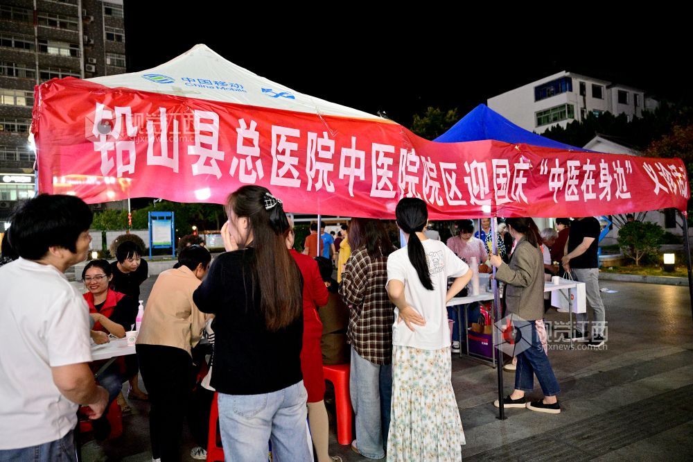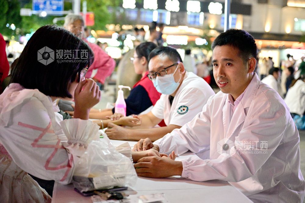 2024年10月4日晚,在江西省上饶市铅山县河口镇辛弃疾新时代文明实践广场,该县中医院医生正在义诊。为弘扬中医药文化,普及中医药治疗知识、养生方法,提高群众健康意识和预防疾病的能力,铅山县中医院开展以庆国庆“中医在身边”为主题的“中医夜市”活动,吸引许多市民前来体验。