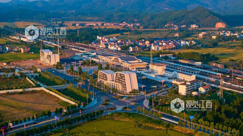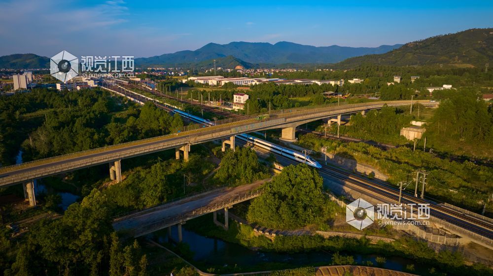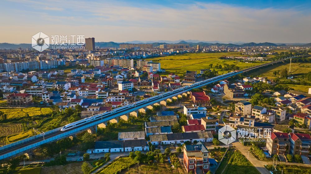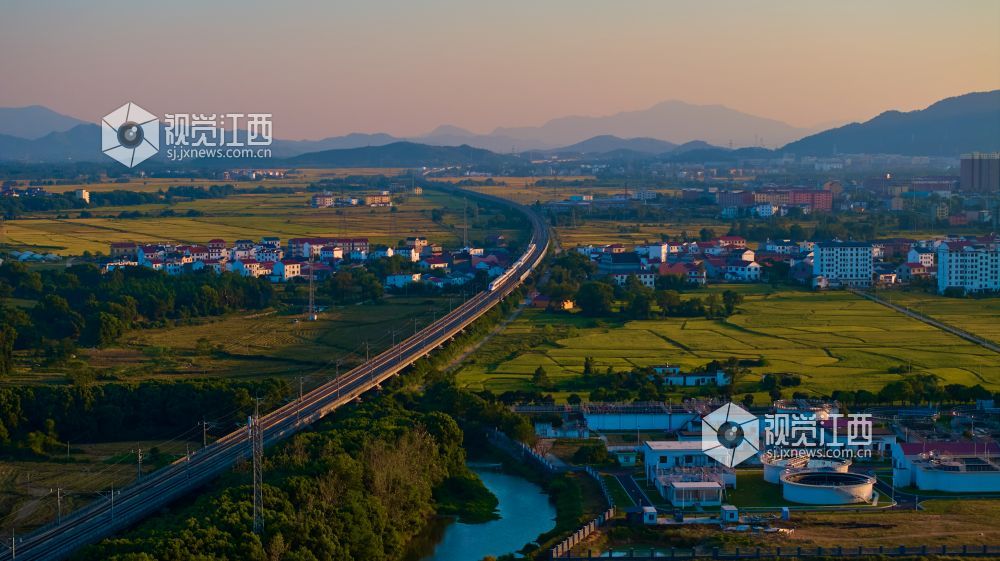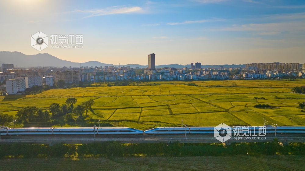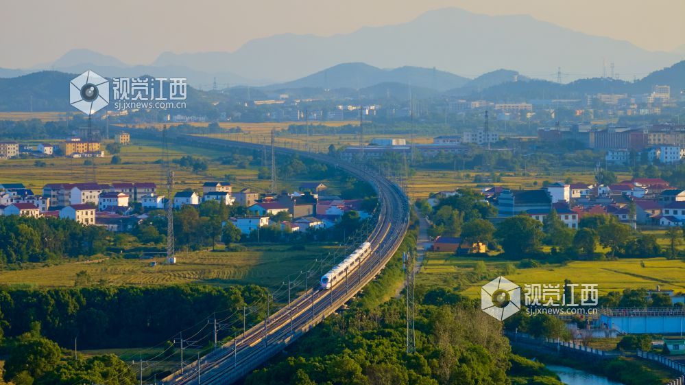 10月5日,在江西省吉安市峡江县水边镇佩贝村、瓈田村等地,一列列高铁从田野上呼啸而过,与蓝天、白云、群山、村庄以及长势旺盛的晚稻相映成景,勾勒出一幅唯美的秋日乡村丰收画卷。