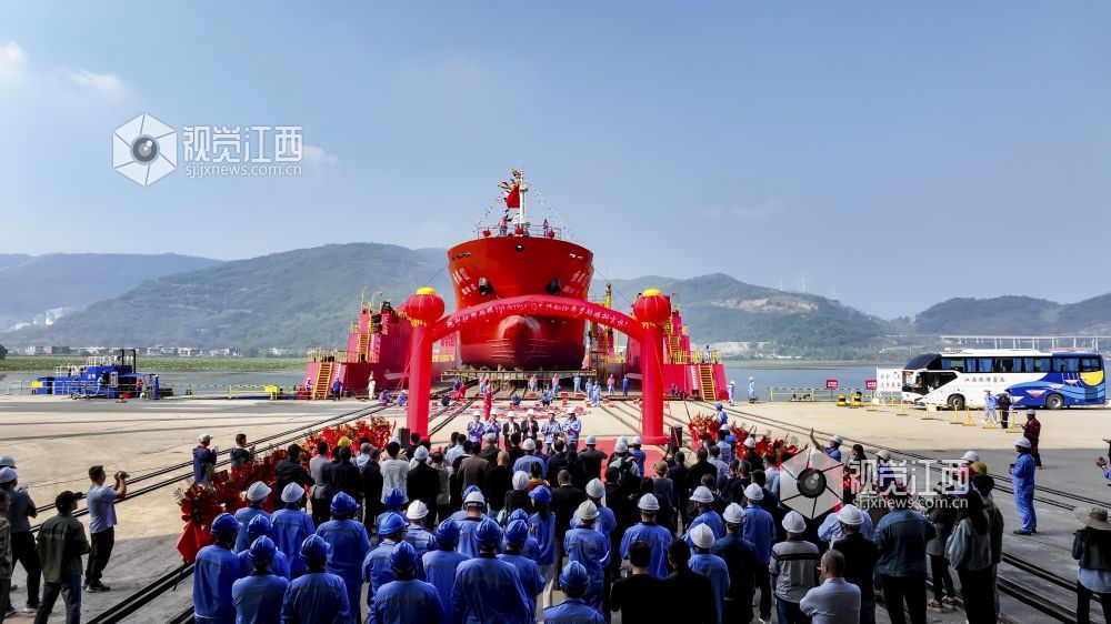 2024年10月9日,江西省瑞昌市黄金乡下巢湖,江西省新江洲船舶重工有限责任公司重组后第一艘船舶正在出坞下水。
