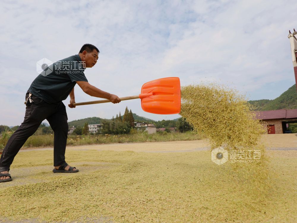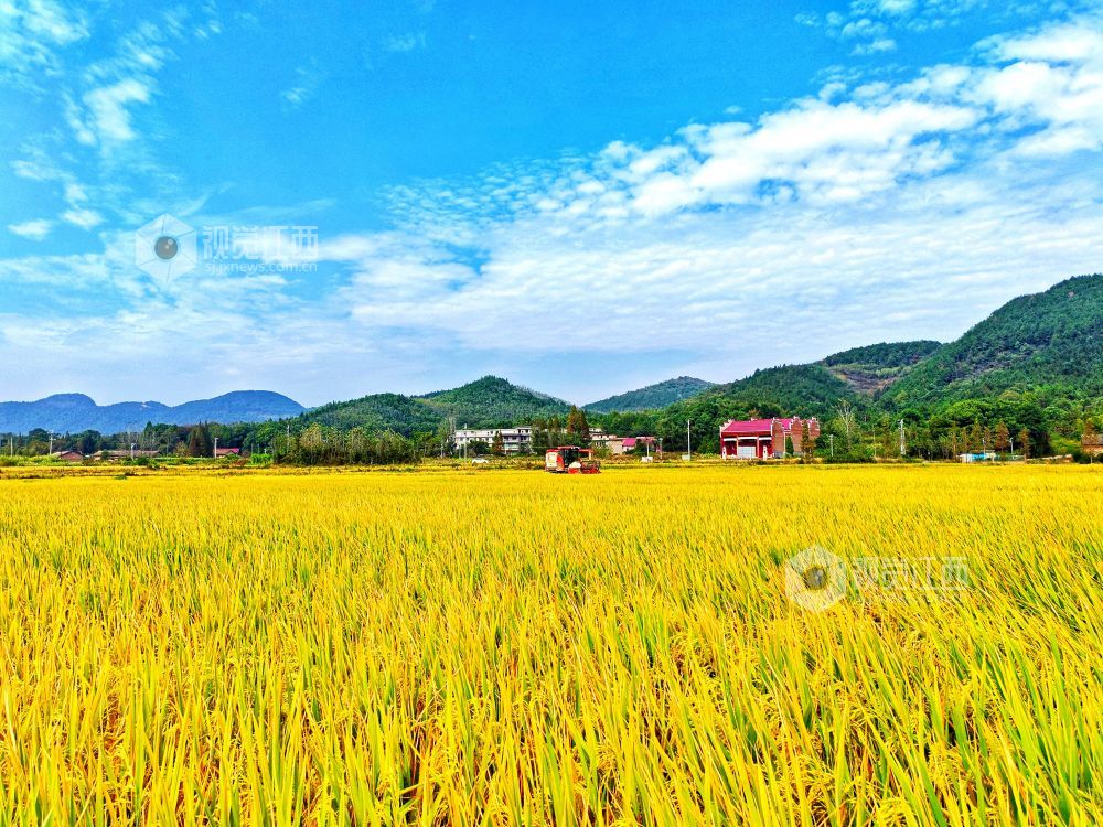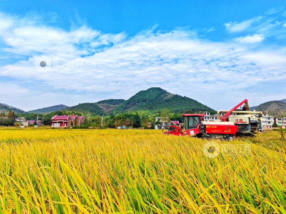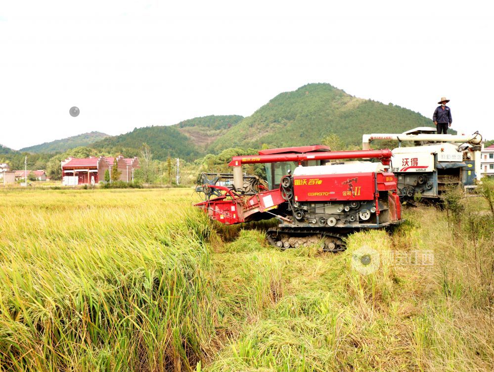 2024年10月12日,江西省分宜县高岚乡下塘村,农机手驾驶收割机正在收割晚稻。连日来,分宜县各乡镇田野染“金”,晚稻进入收割季,当地村民利用晴好天气加紧收割、晾晒稻谷,确保颗粒归仓,田间地头一派繁忙的劳作景象。