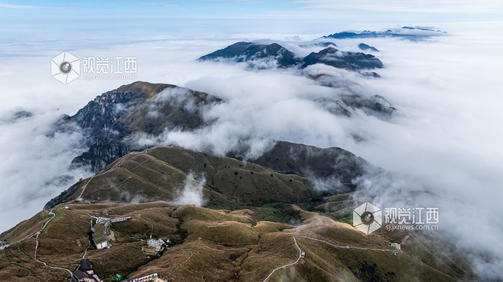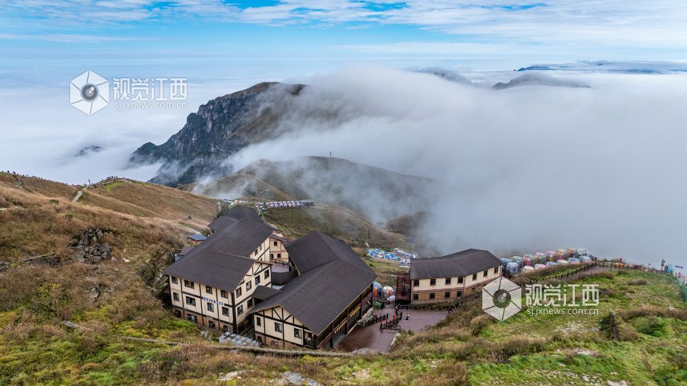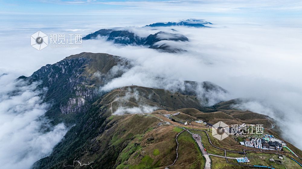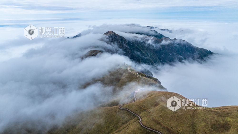 10月20日,深秋时节,江西安福武功山景区十万亩高山草甸披上了金黄的盛装,白色的芦苇花在阳光下绽放出夺目的光彩,云海翻涌蔚为壮观。朝阳缓缓升起,雪白的云团由静而动,如海浪般在空中翻滚碰撞,浩瀚无比,壮丽的秋日美景吸引了众多游客前来欣赏拍摄。