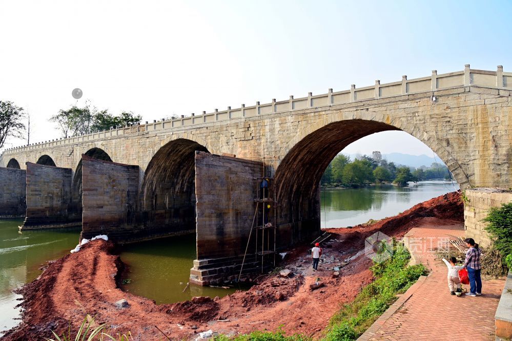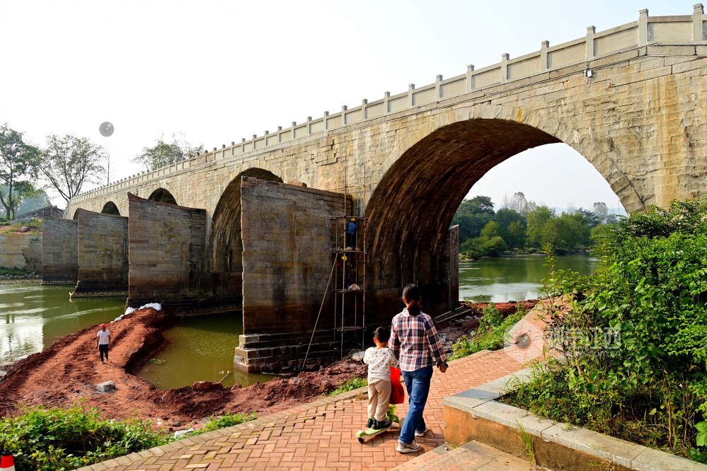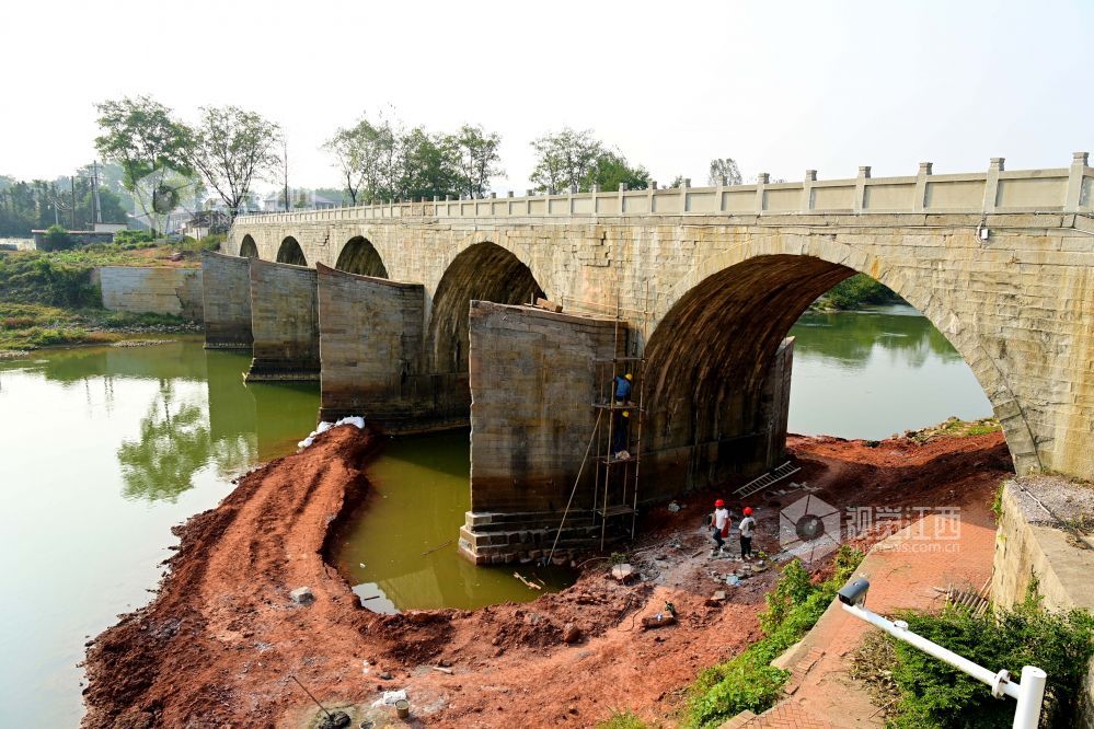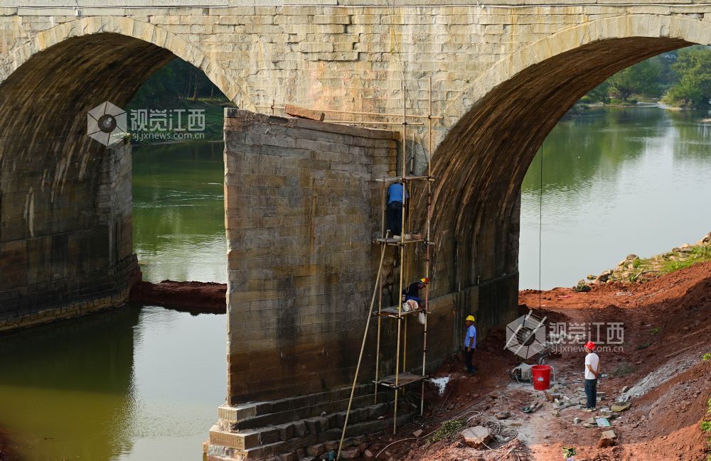 2024年11月5日,江西省宜春市万载县鹅峰乡多江村正在修缮始建于清代的五孔鹏程古桥。