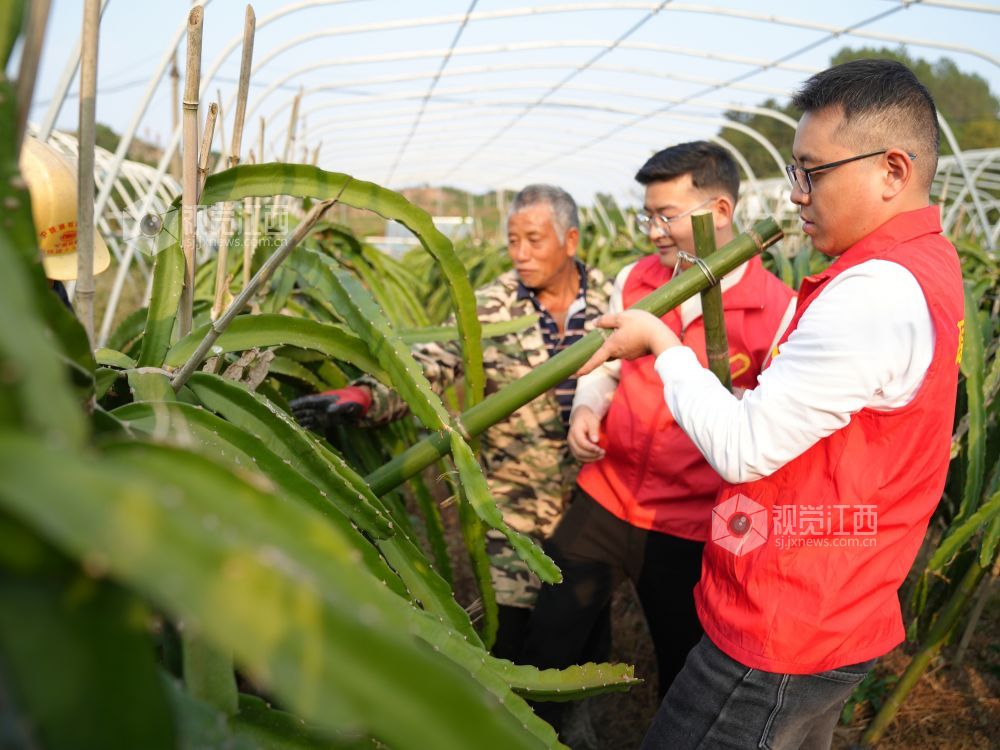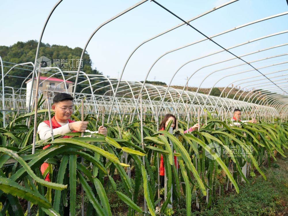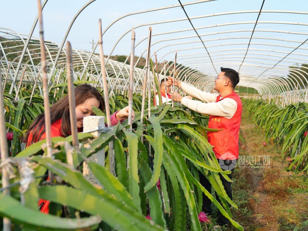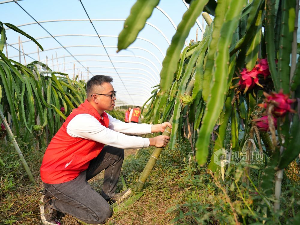 2024年11月5日,在江西省萍乡市芦溪县源南乡石塘村火龙果种植基地,源南乡年轻干部正在给火龙果搭架。