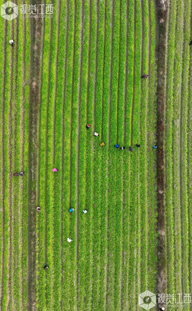 2024年11月12日,江西省宜春市万载县马步乡宝石村,村民们正在对种植的榨菜苗进行管护。