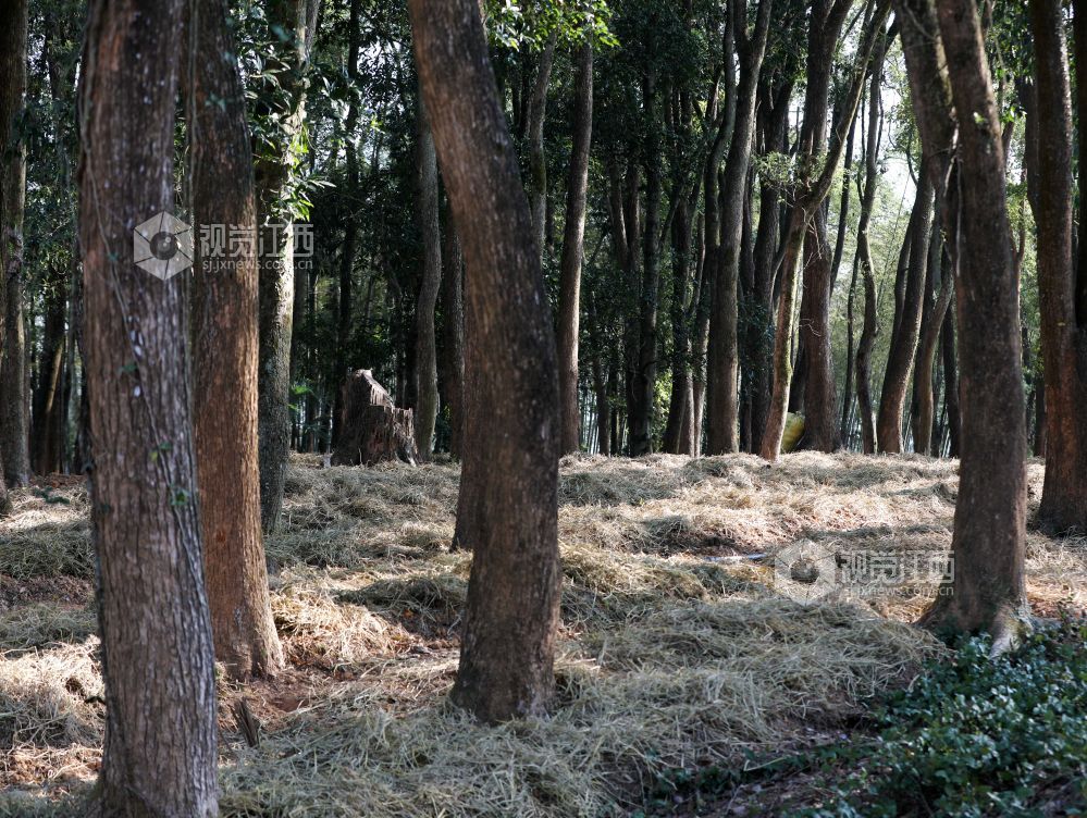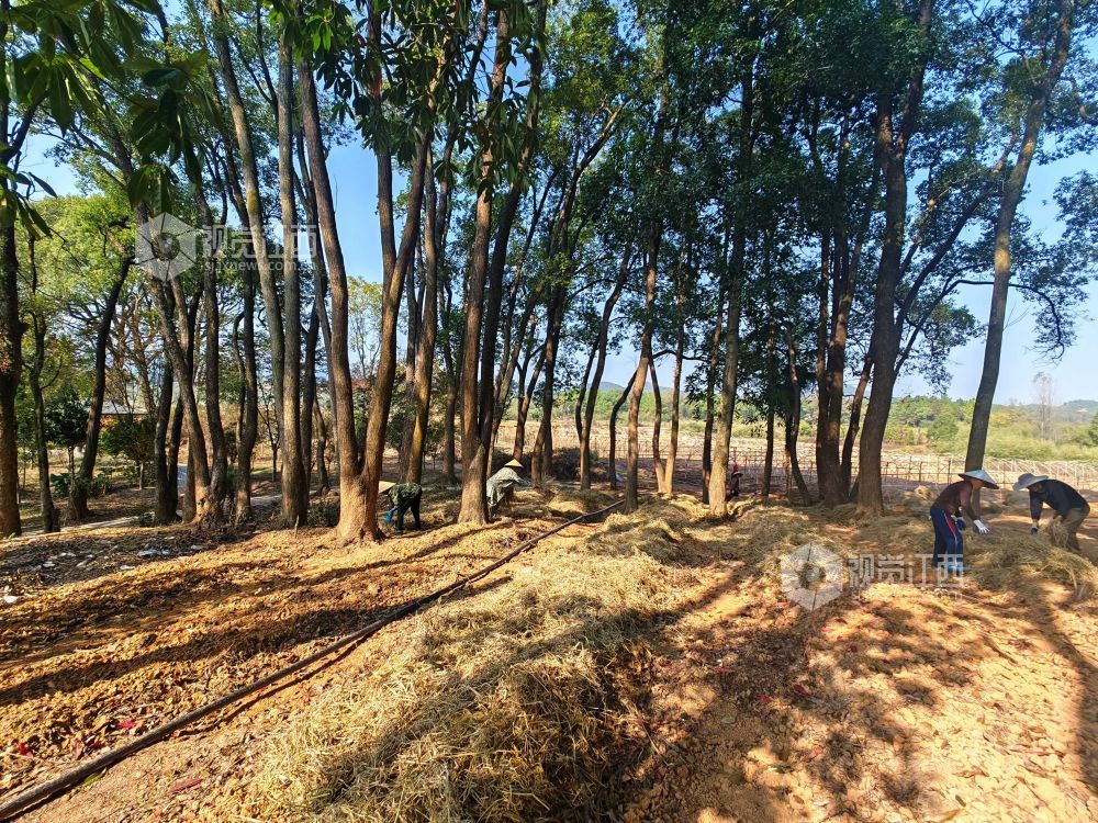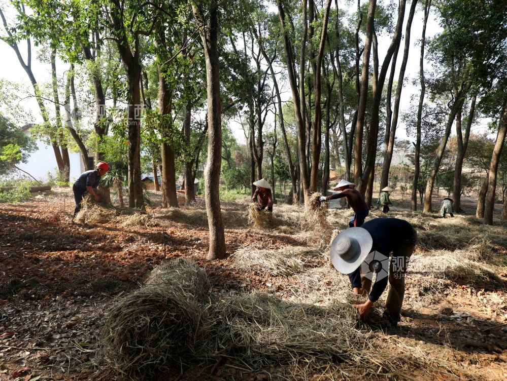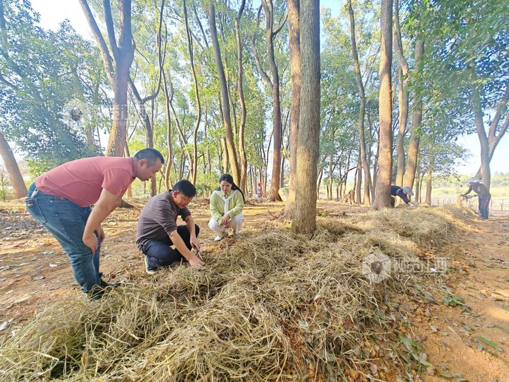 2024年11月13日,江西省分宜县操场乡太湖村,村民正在树林间覆盖水稻秸秆种植赤松茸。近年来,分宜县依托丰富的森林资源,大力发展林下经济,引导农民采取“合作社+基地+农户”的模式,在林间种植竹荪、赤松茸、木耳等菌类,促进农民增收。