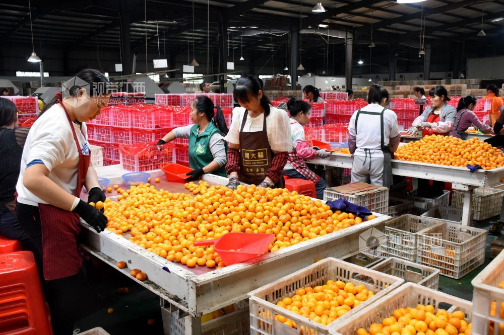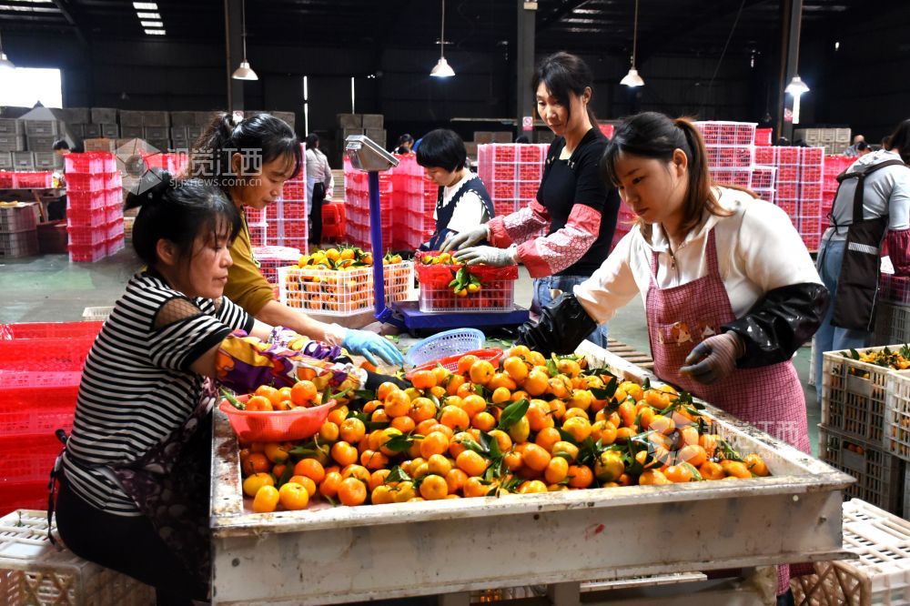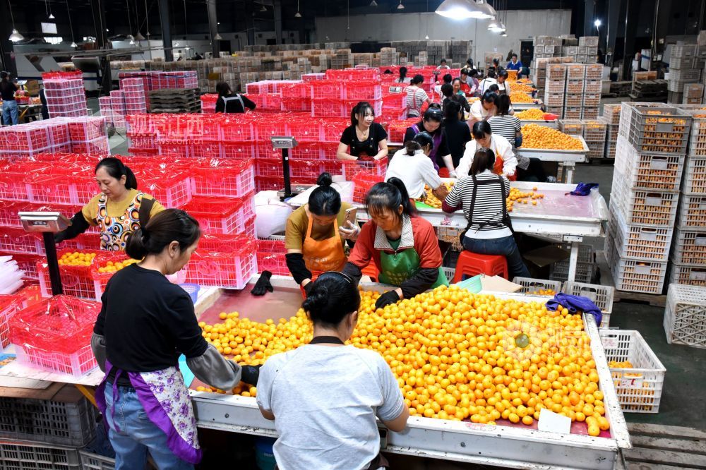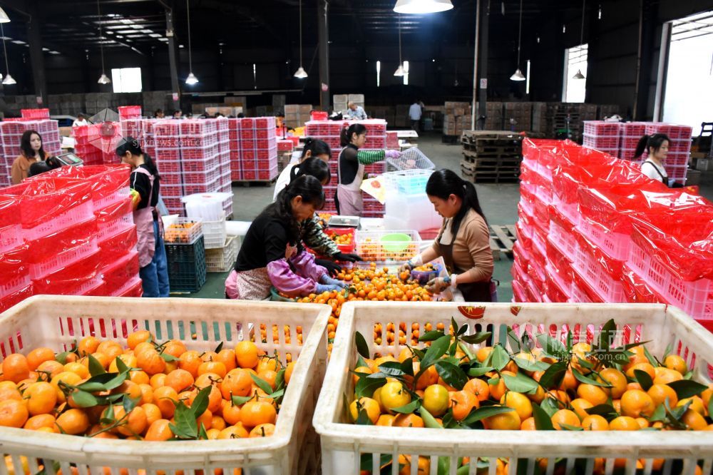 2024年11月17日,江西省抚州市南丰县鸿远果业公司车间内,工人们正在分拣、包装南丰蜜橘,满足出口订单需求。