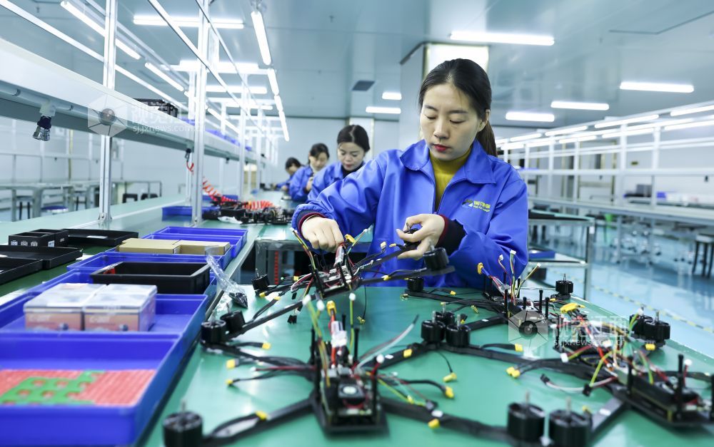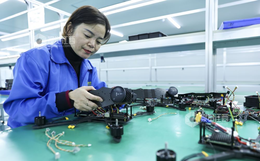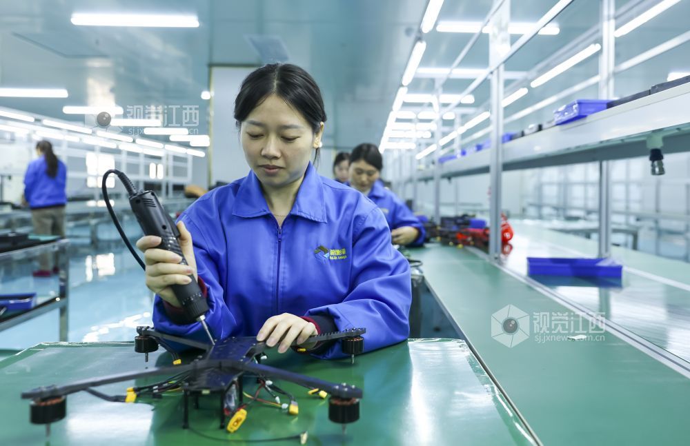 2024年11月27日,江西省瑞昌经开区科技园江西瑞欣影像智能科技有限公司车间内,工人们正在生产线上赶制国外订单。 近年来,该企业不断提升科技创新能力,改进优化生产工艺,出口订单络绎不绝,自主研发的无人机、AI智能家电等产品俏销欧美、东南亚等市场。