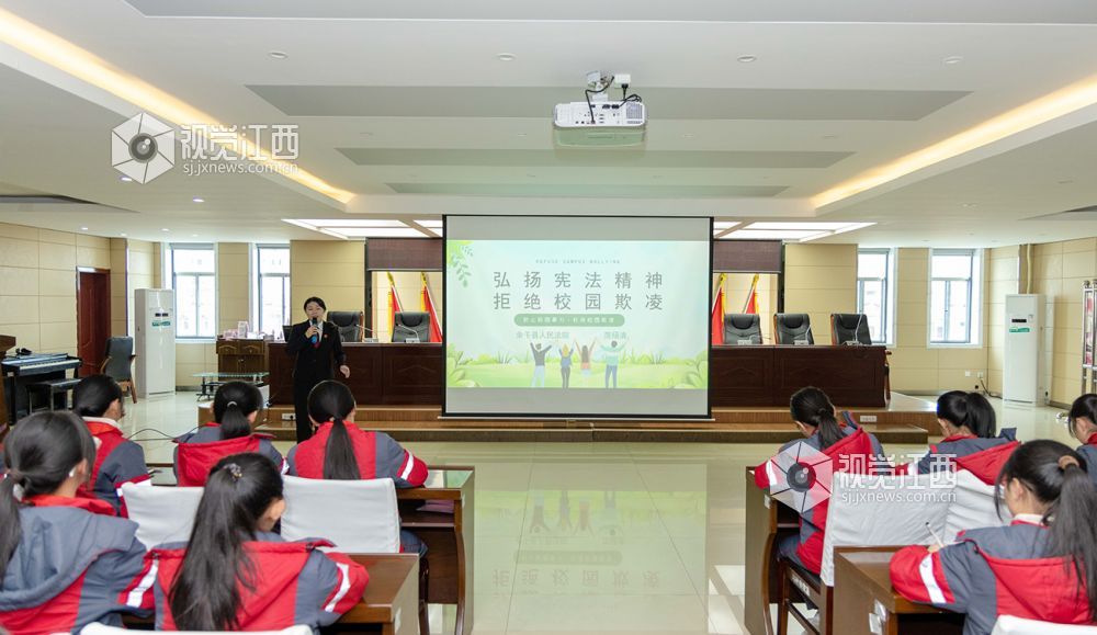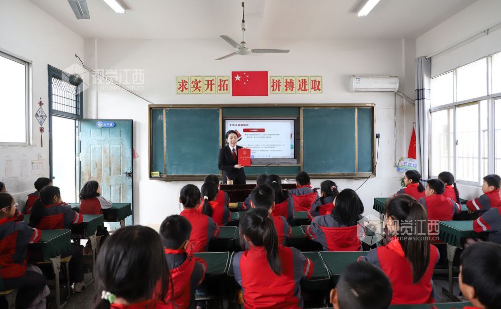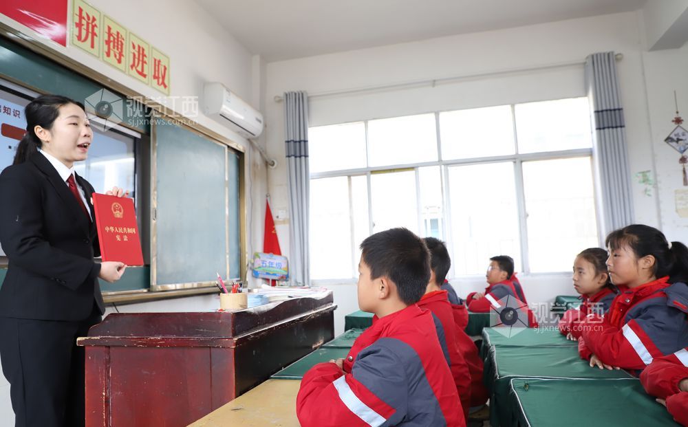 12月4日,在江西省余干县梅溪中心小学,该校法治副校长、余干县人民法院干警正在给学生们讲解宪法知识。连日来,余干县第二小学、余干县第九小学等学校以多种形式开展“宪法知识进校园”系列活动,通过普及宪法知识、开展主题班会、宪法晨读、制作手抄报等形式,弘扬宪法精神,增强学生们学法、知法、守法意识。