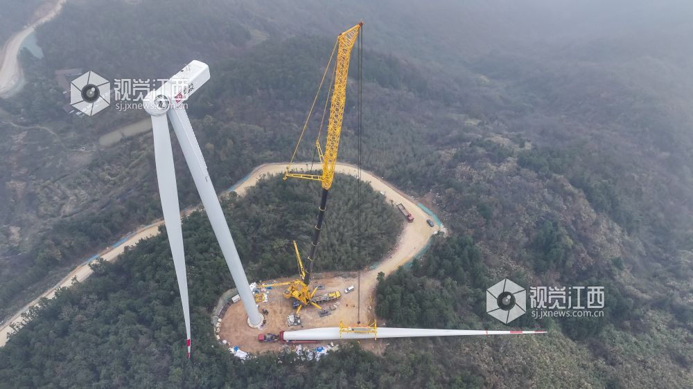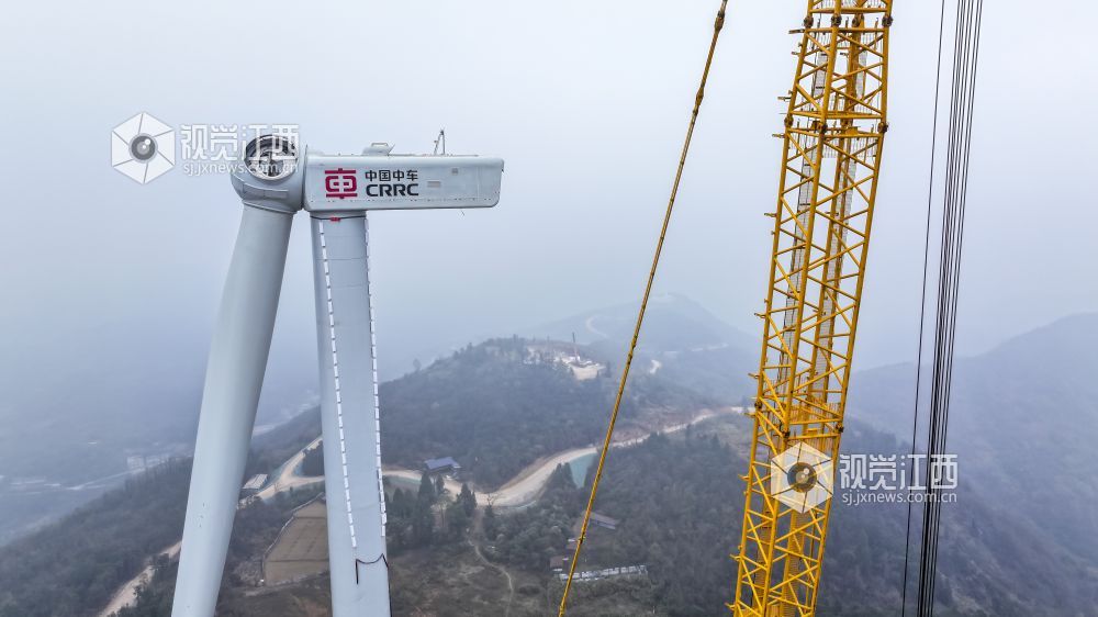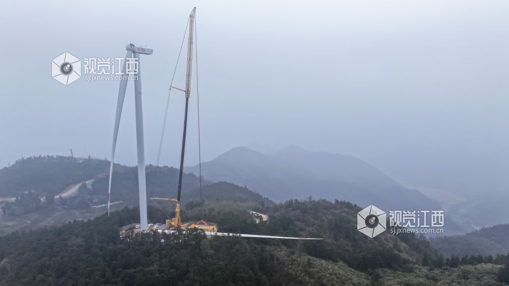 2024年12月4日,江西省瑞昌市横立山风电场二期项目施工现场,中国电建集团江西省水电工程局的工人们正在吊装风电叶片。