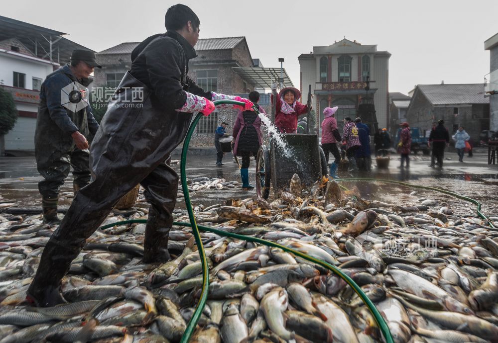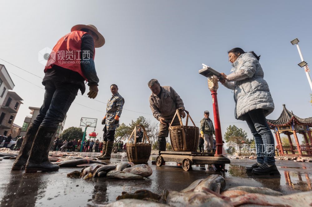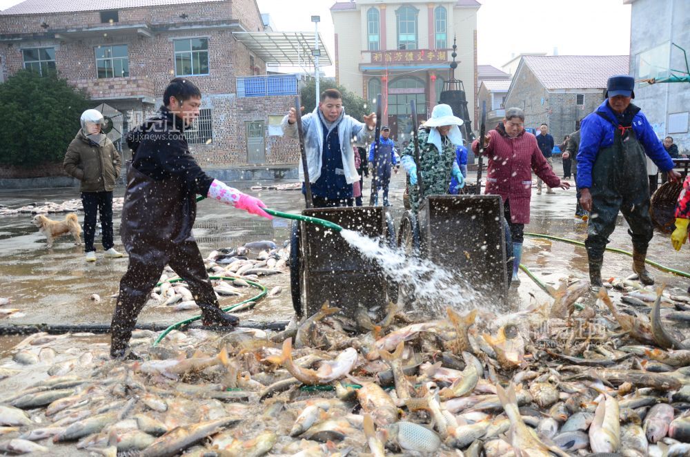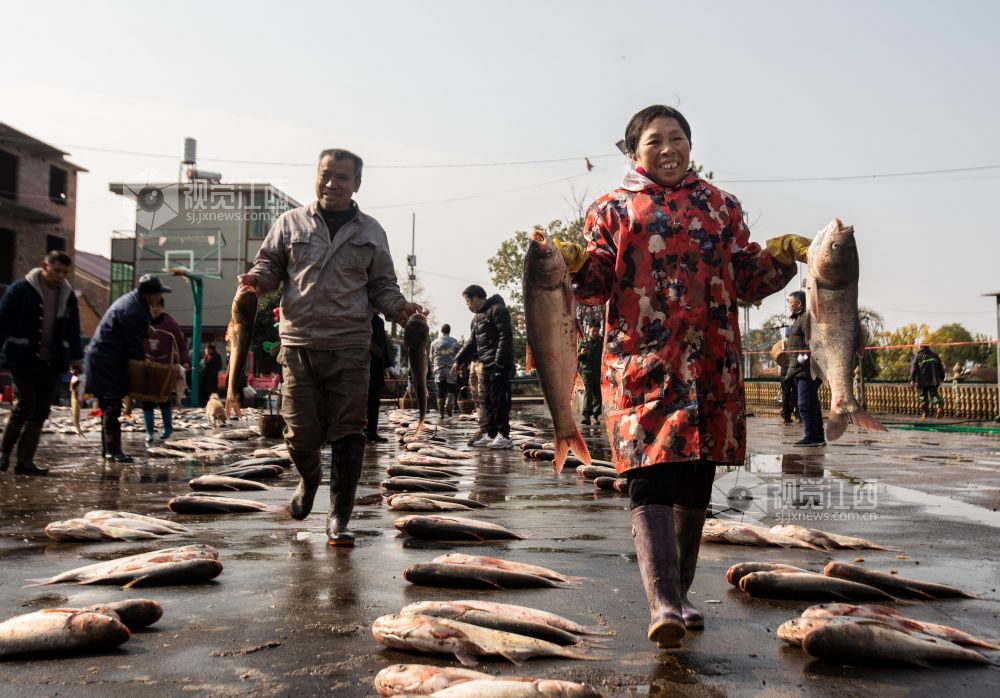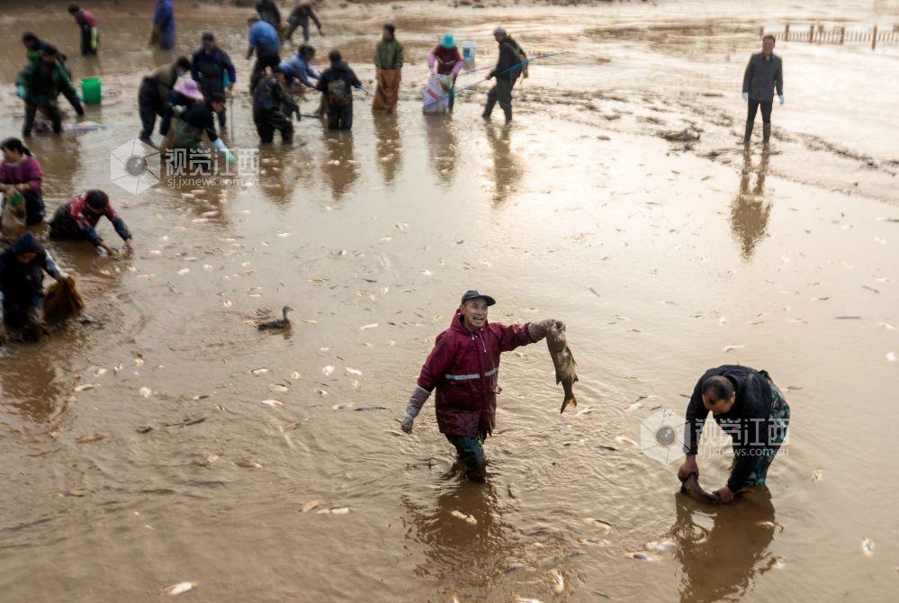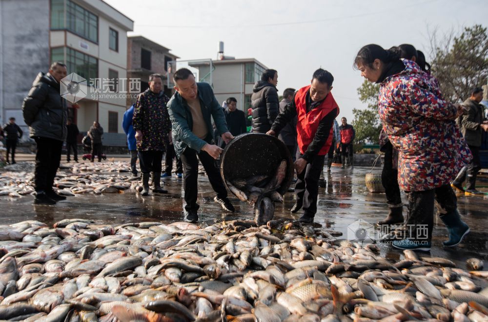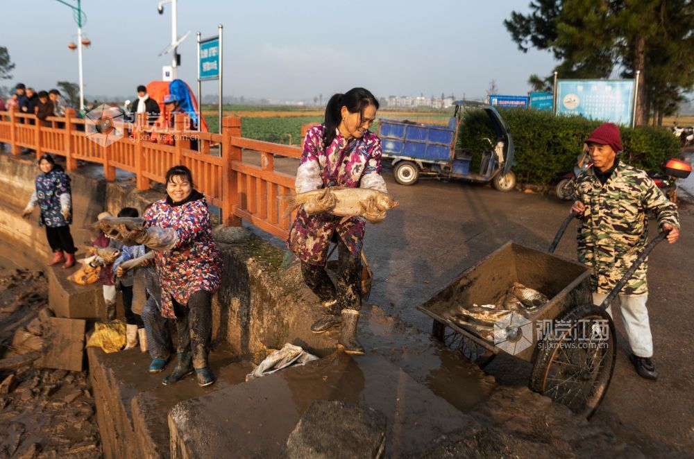 12月14日,江西省永新县高市乡塘内村热闹非凡,一场干塘分鱼活动在此欢乐上演。男女老少齐下塘,捕鱼捞鱼忙不停,现场欢声笑语,鱼跃人欢。