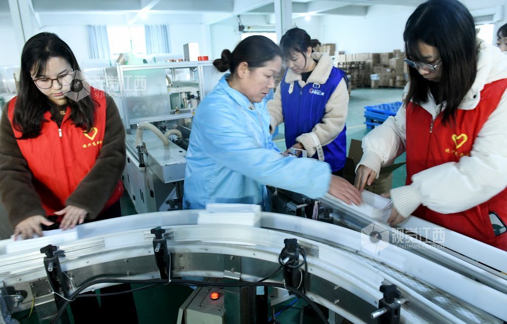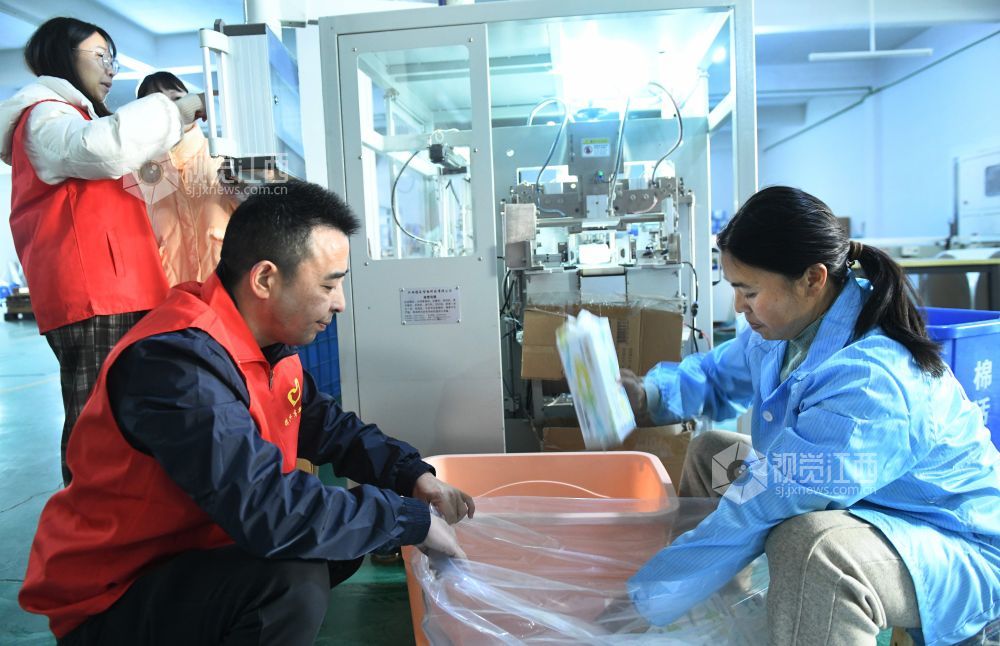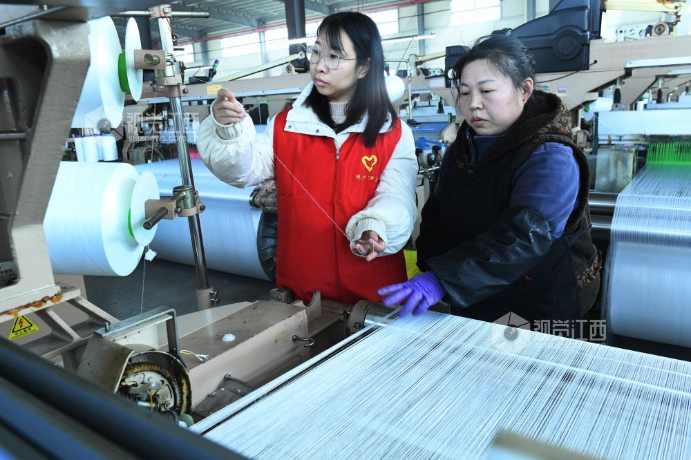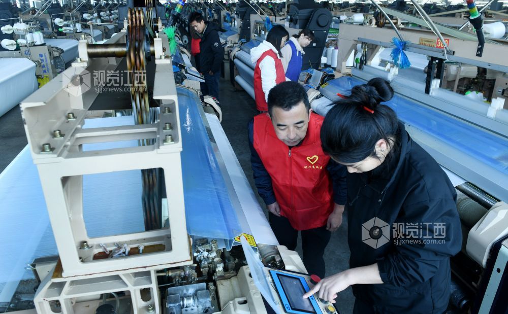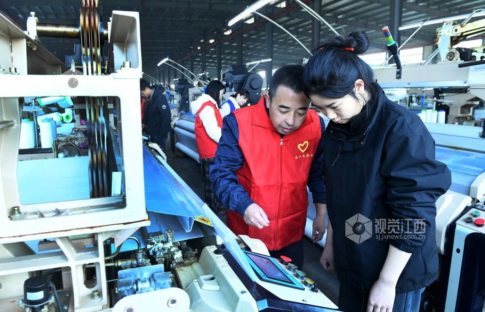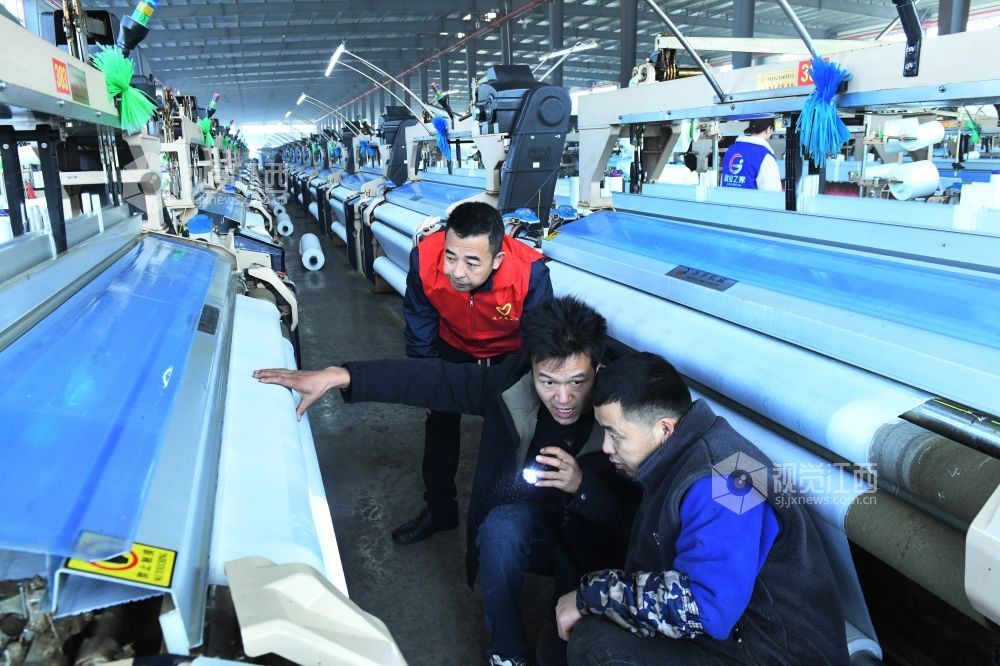 2024年12月14日,在江西德兴高新区一纺织企业车间,该高新区党员干部正在服务企业赶制订单产品。