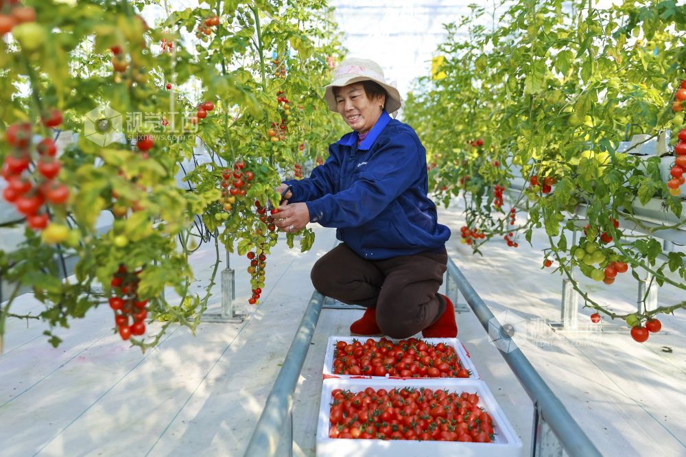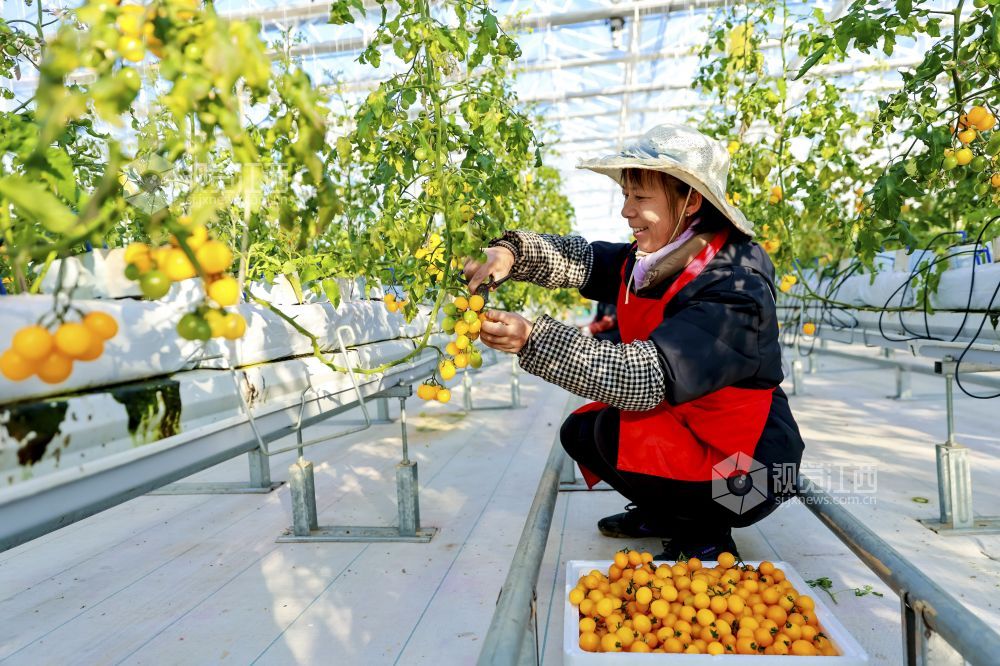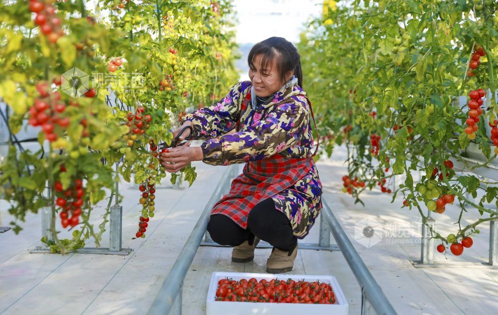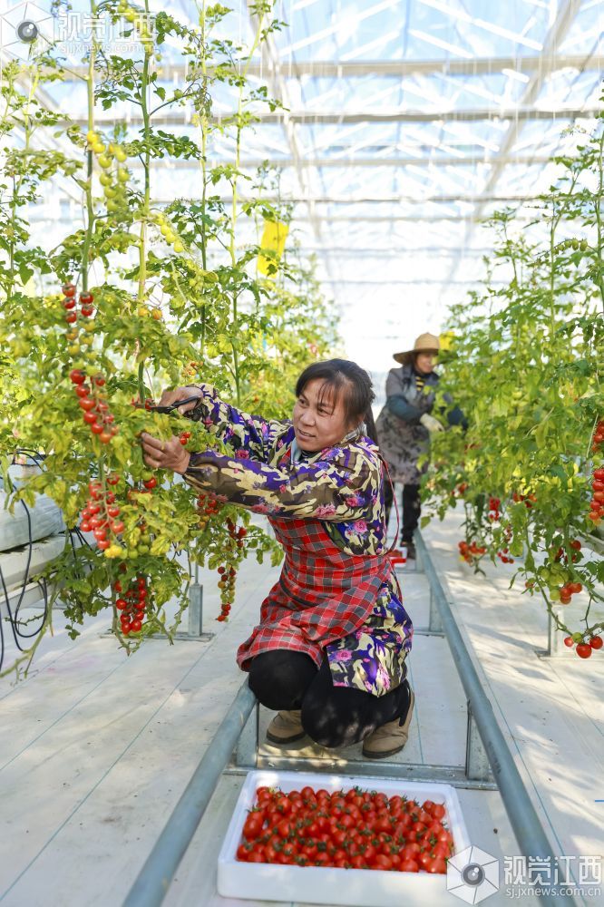 2024年12月19日,江西省瑞昌市高标准设施蔬菜示范中心,工人正在采摘西红柿,供应市场。