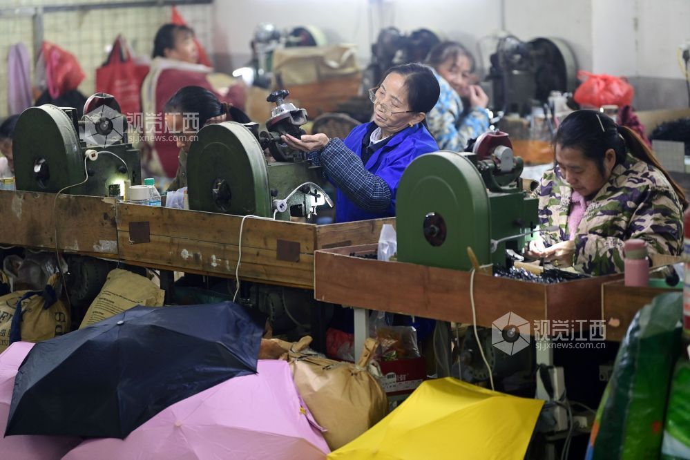2024年12月19日,江西省宜春市万载县白水乡白水社区脱贫户在异地搬迁安置点“帮扶车间”加工伞架。