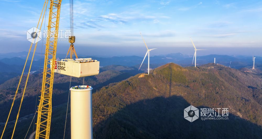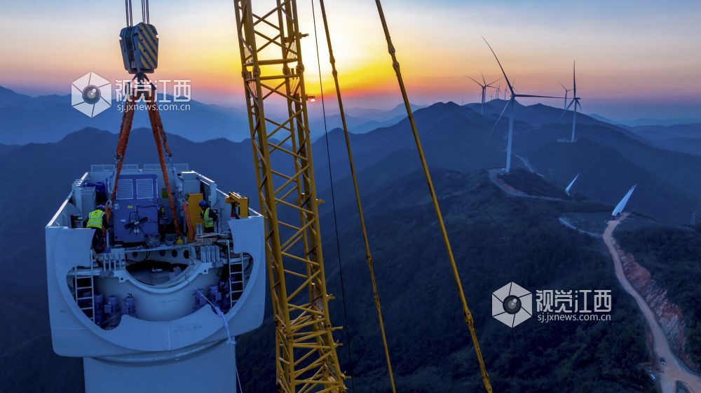 2024年12月20日,江西省瑞昌市横立山风电场二期项目施工现场,中国电建集团江西省水电工程局的工人们正在吊装风电机组。