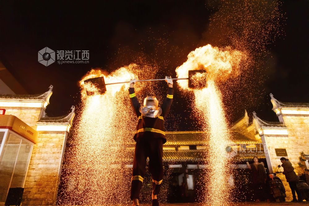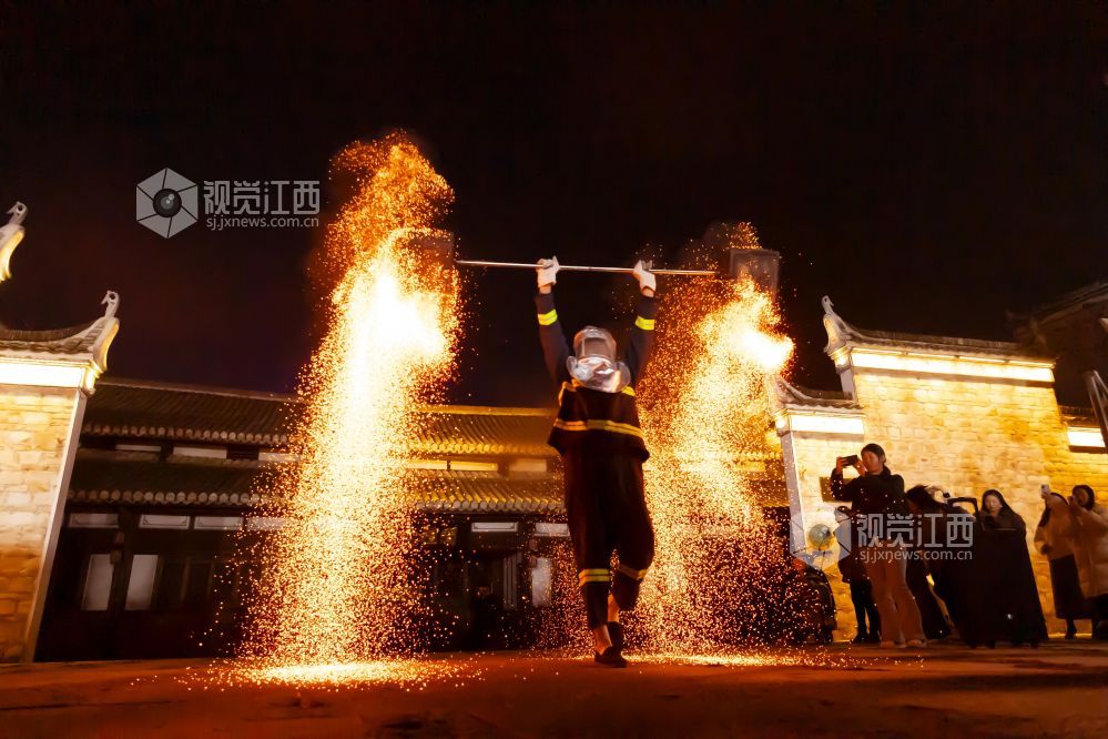 2025年1月3日,在江西省宜春市万载县古城景区举行火壶表演,吸引许多游客驻足观赏。