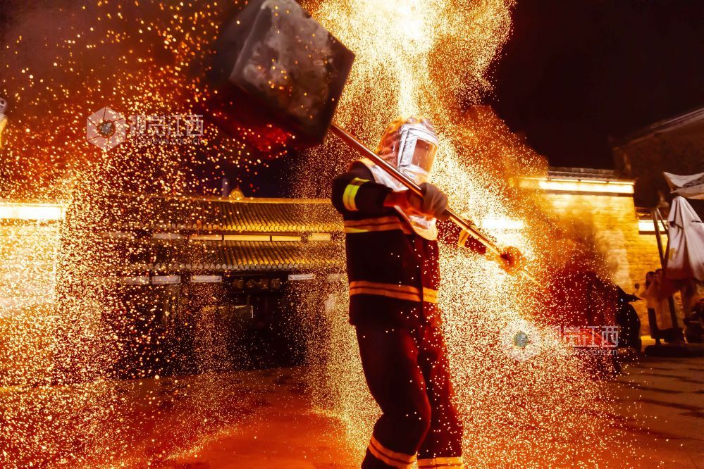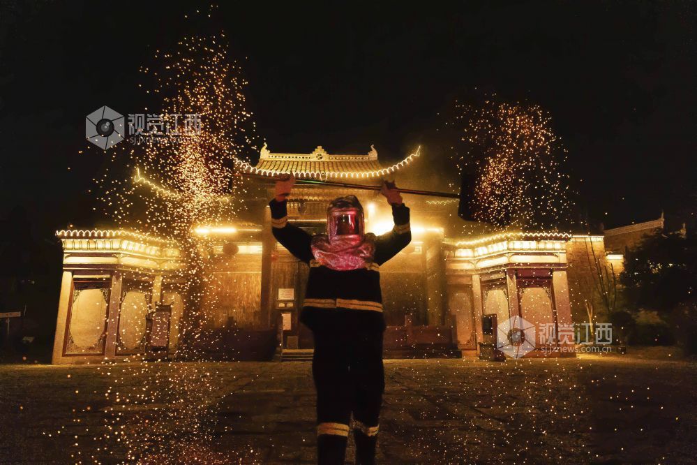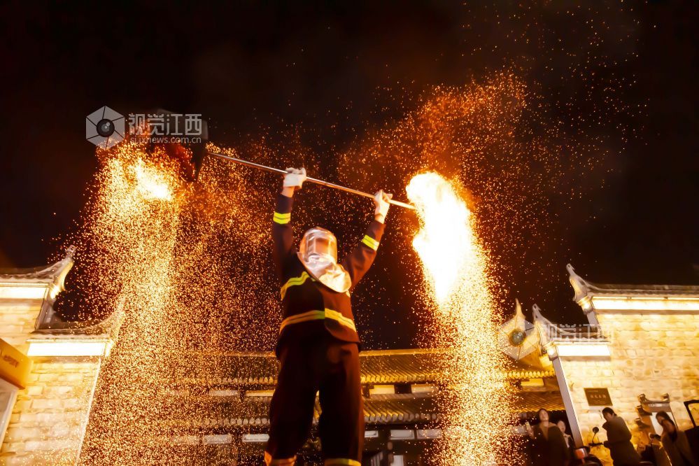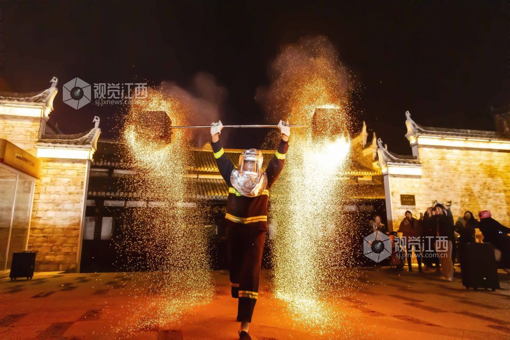 火壶表演是一种民间艺术表演,身着防火服的表演者将烧红的木炭放入铁网制成的壶内,手持挥舞使之产生如烟花般绚丽的火花。