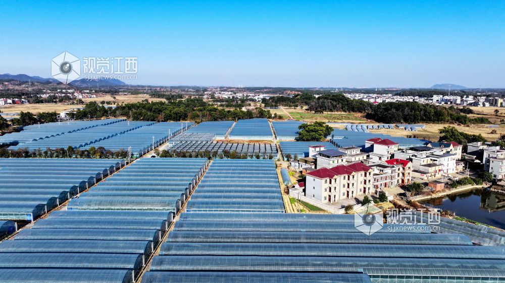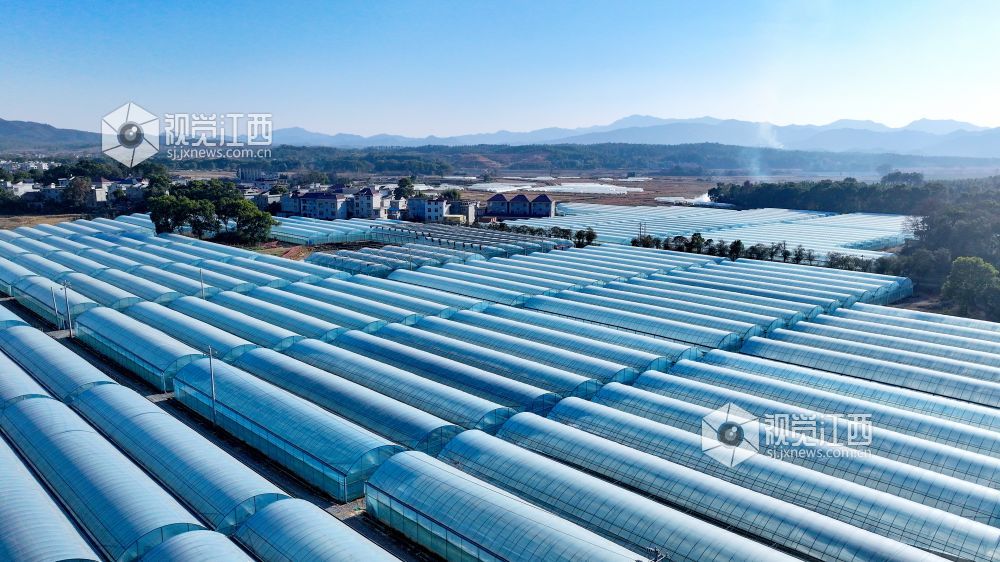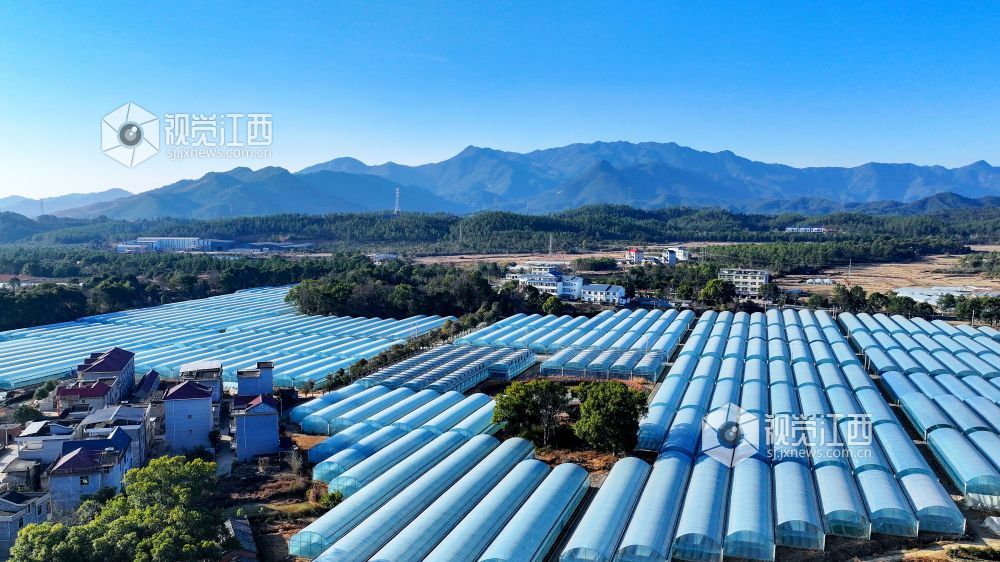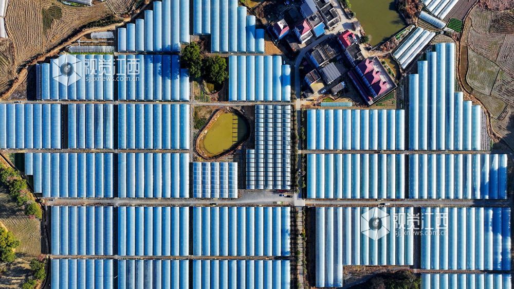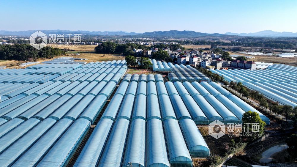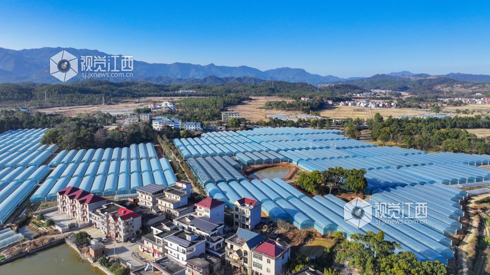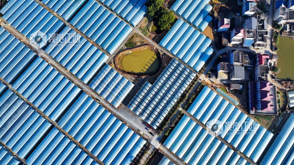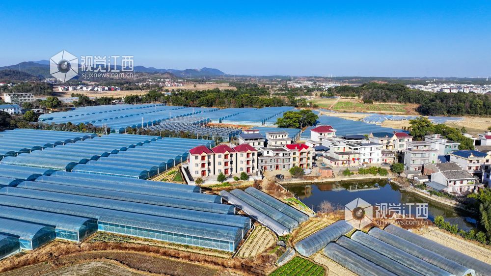 2025年1月13日,江西省吉安市吉水县乌江镇果树园村,整齐排列的蔬菜大棚和错落有致的民居交相辉映,美不胜收。