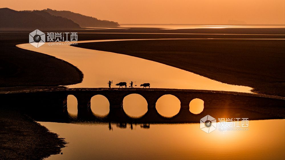当夕阳缓缓沉入地平线,天边的云彩被染上绚丽的色彩,位于鄱阳湖中的五眼桥笼罩在金色的余晖中,与周围自然景观融为一体,美不胜收。随着岁月的流逝,桥下波涛汹涌,桥上人来人往,然而五眼桥始终巍然不动,见证着这片土地的变迁。