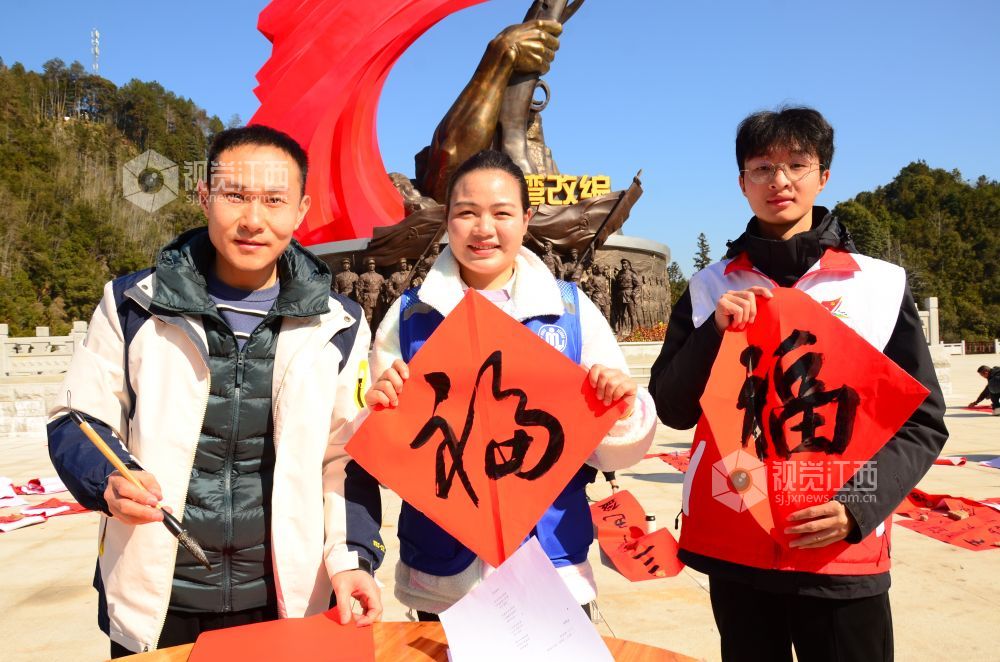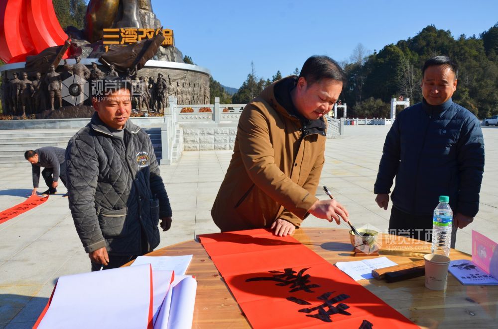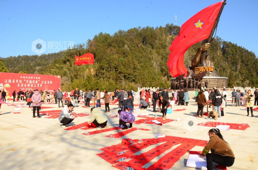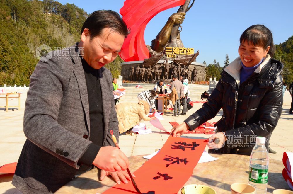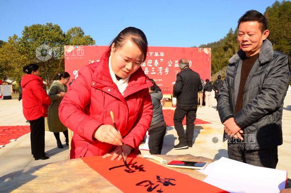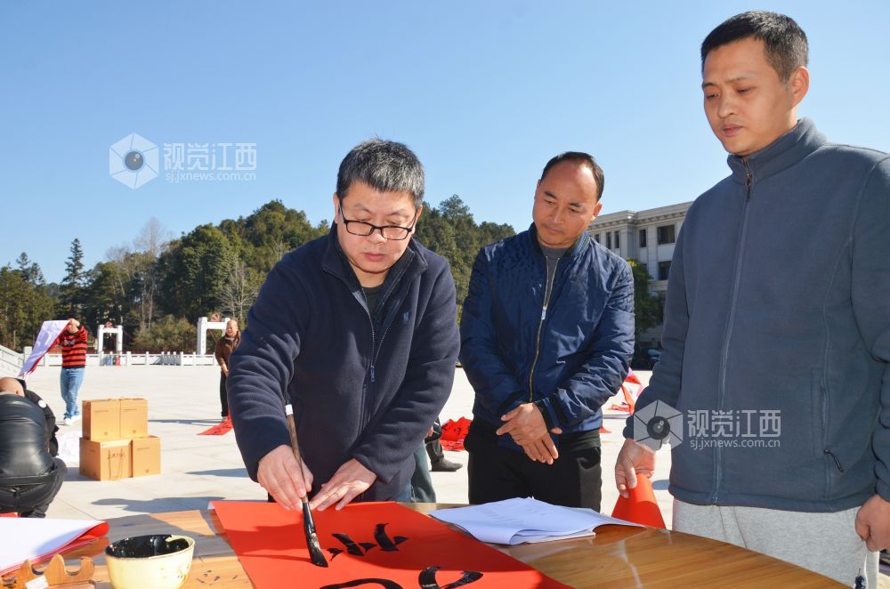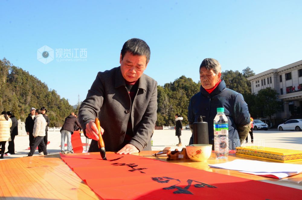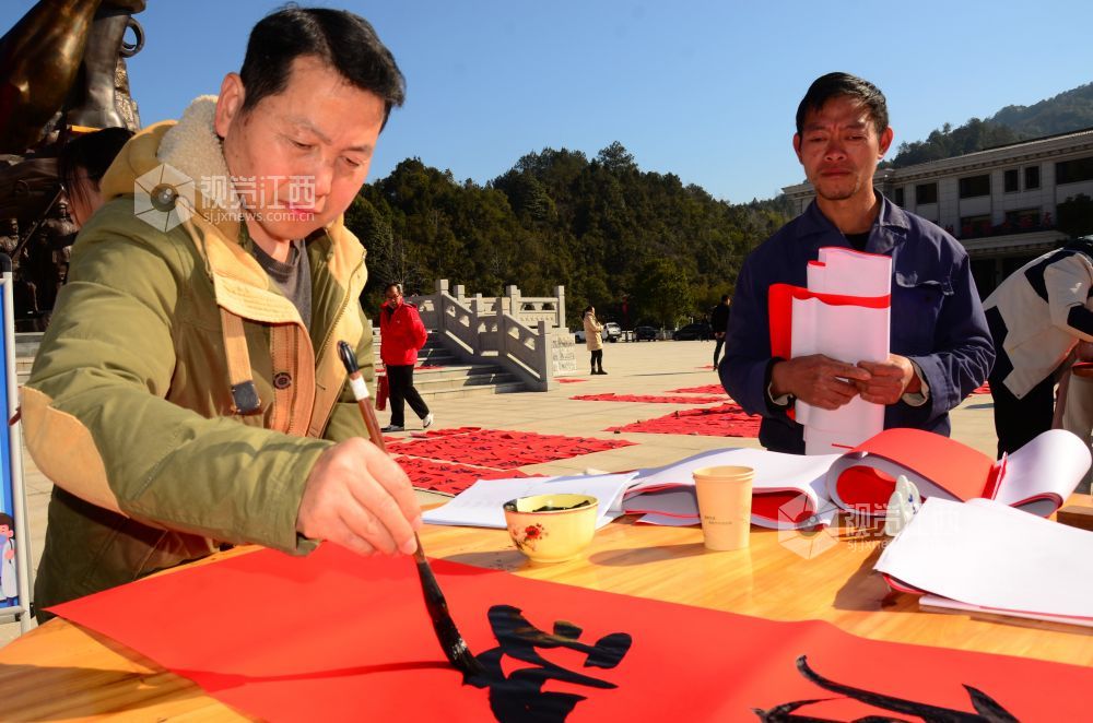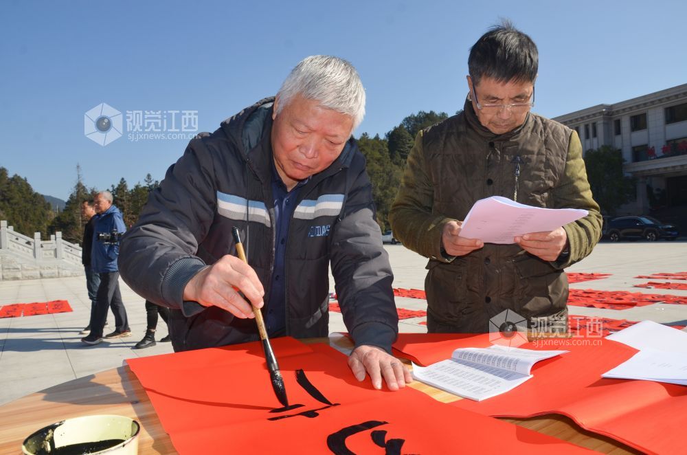 1月13日,在江西省吉安市永新县,万名文艺家下基层——江西省书法家协会“万福迎春”公益活动火热开展。书法家们现场挥毫泼墨,为当地群众书写春联和“?!弊郑衙篮玫淖8S肱ㄅǖ墓匕偷饺褐谑种?。