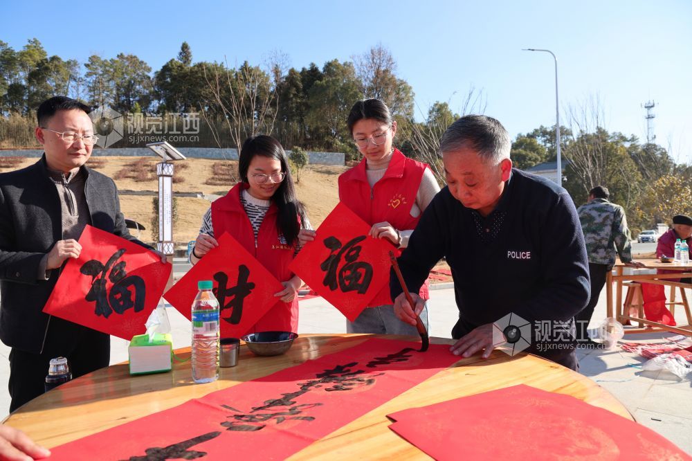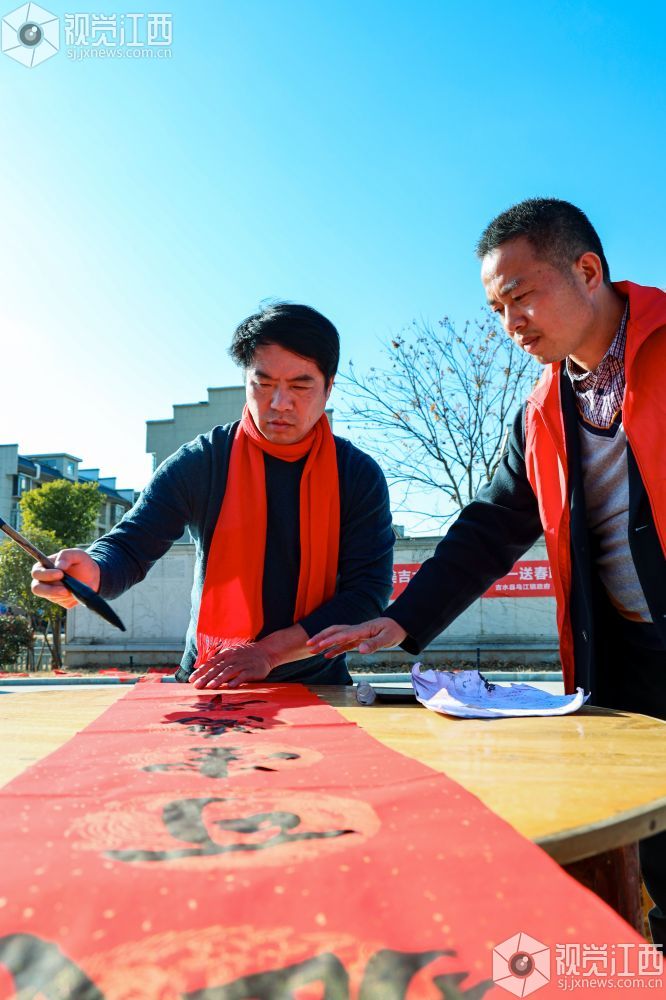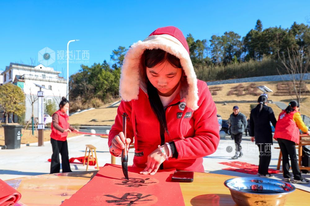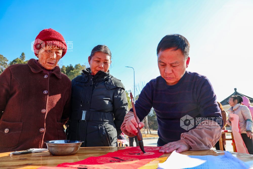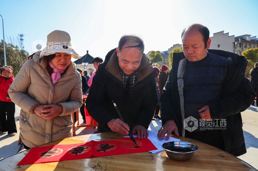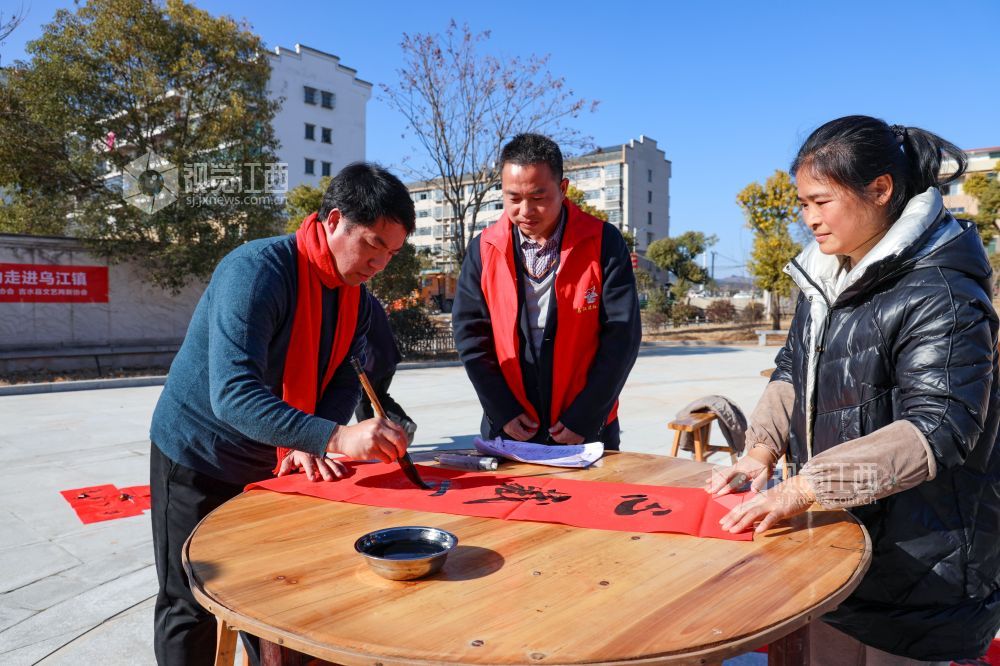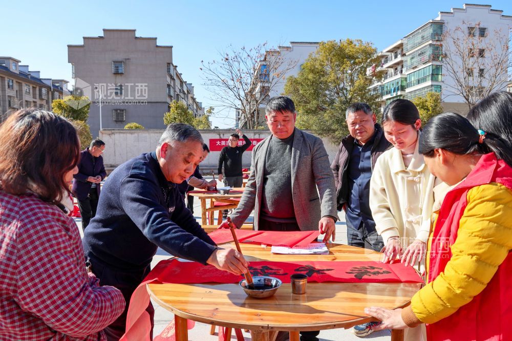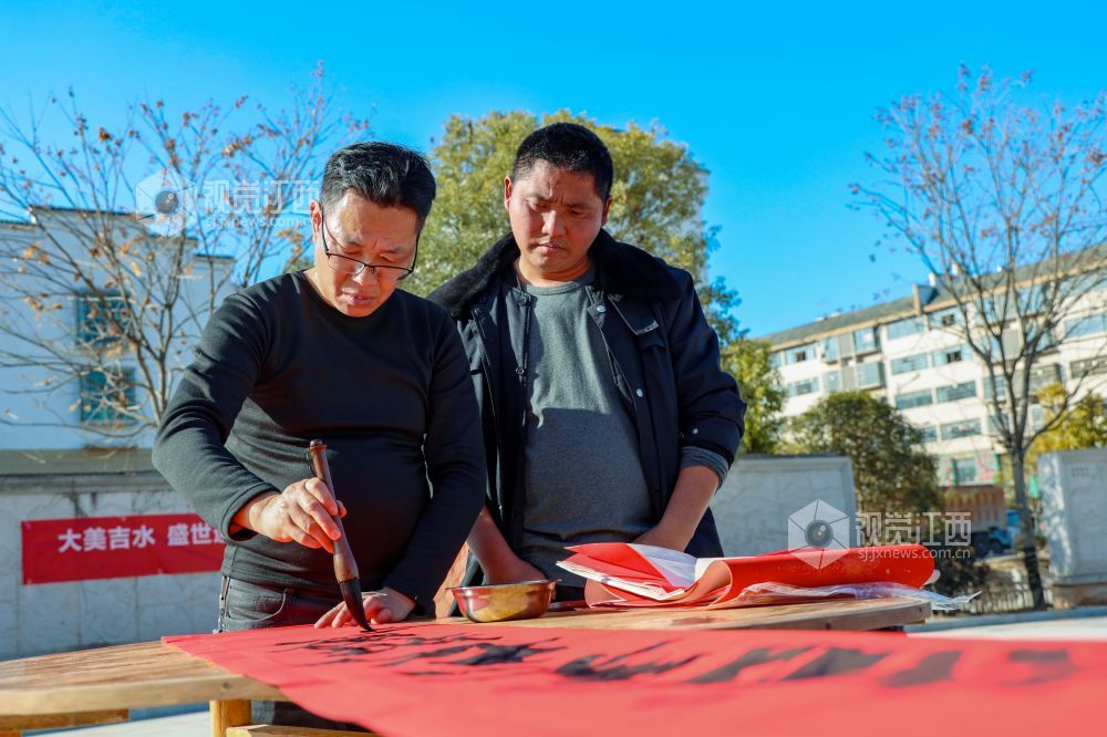 2025年1月13日,江西省吉安市吉水县乌江镇,书法爱好者正在为村民免费书写春联。春节将至,江西省吉安市吉水县组织书法爱好者走进社区、乡村等地开展新时代文明实践活动,为群众写春联、送福字。