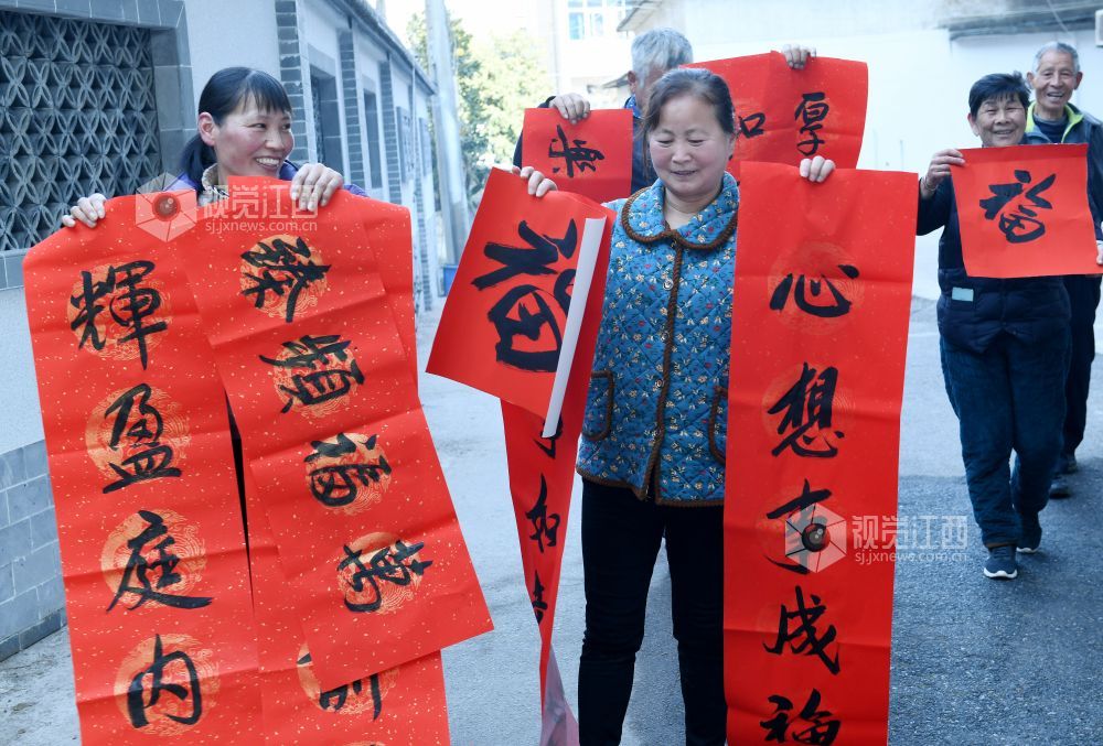 2025年1月21日,江西省德兴市香屯街香屯村,村民开心在家门口领到了该市书法家们送来的春联。
