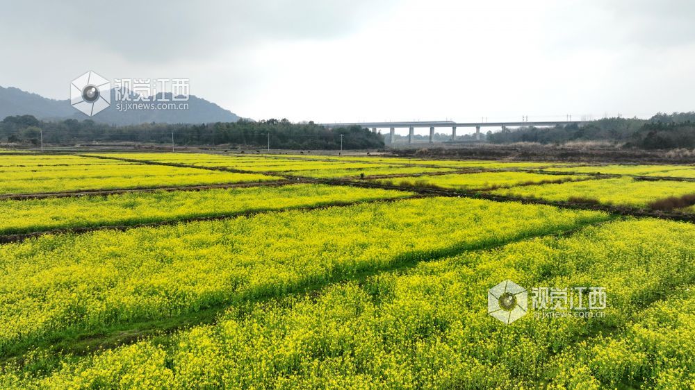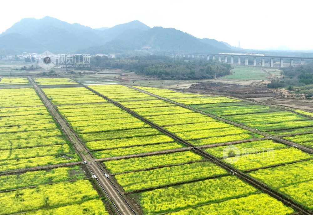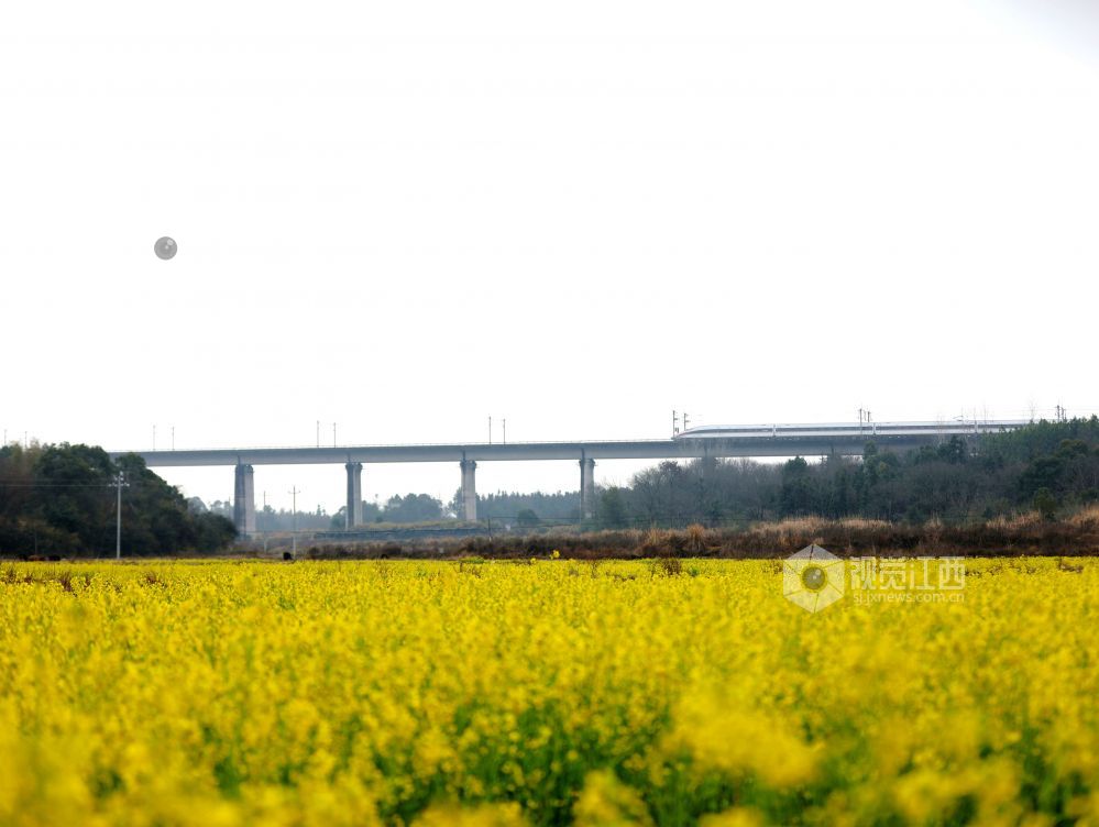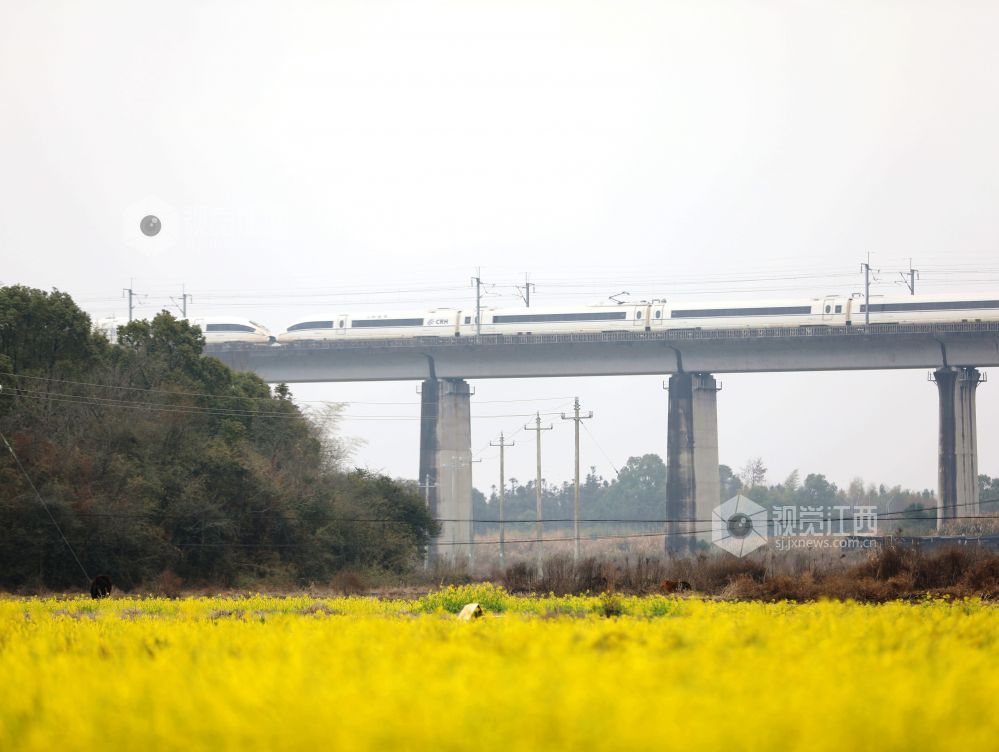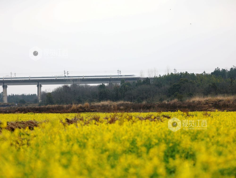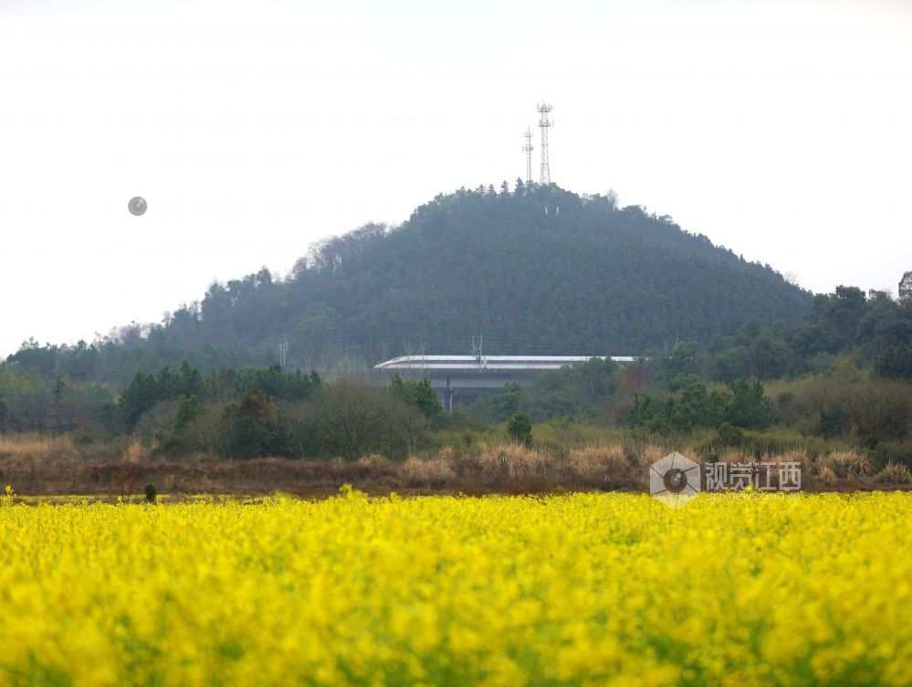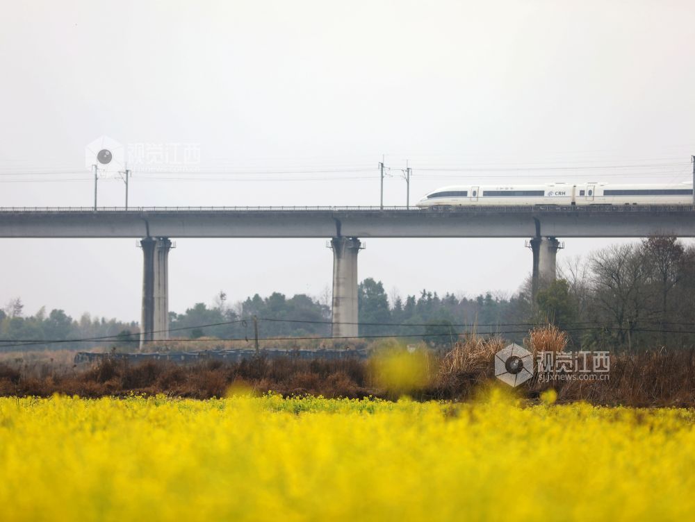 2025年2月19日,江西省分宜县凤阳镇沔村村箬坑的油菜花竞相绽放,和谐号动车组列车从油菜花海中疾驰而过。