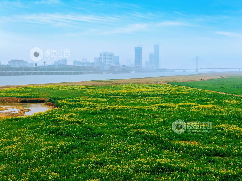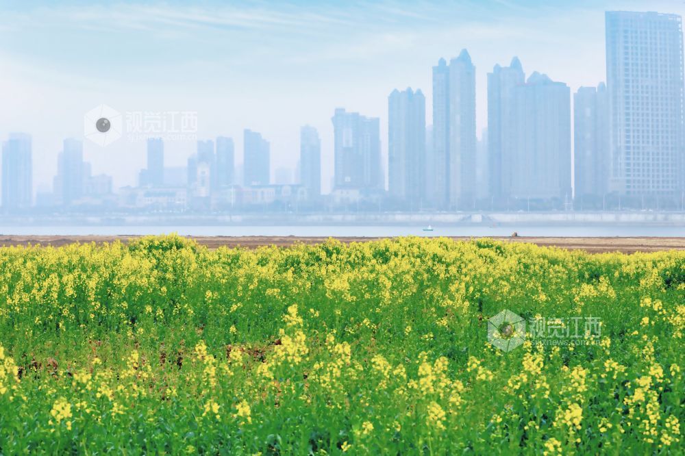 2月21日,江西省南昌市东湖区扬子洲镇的油菜花竞相绽放,金黄色的油菜花与赣江对岸的城市建筑相映成趣,构成一幅美丽的春日画卷。