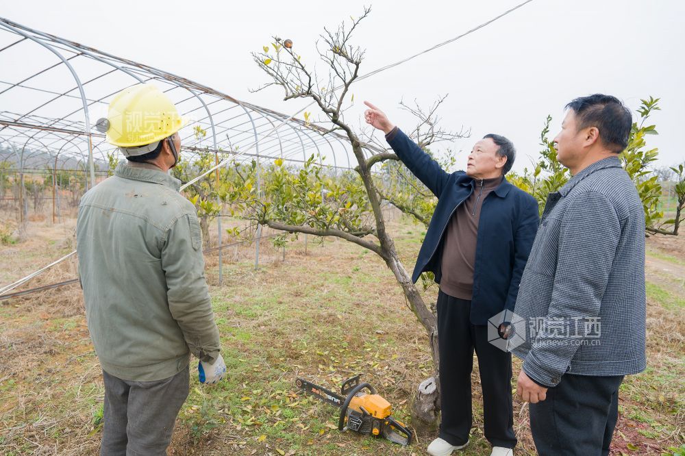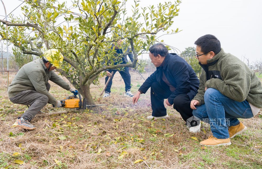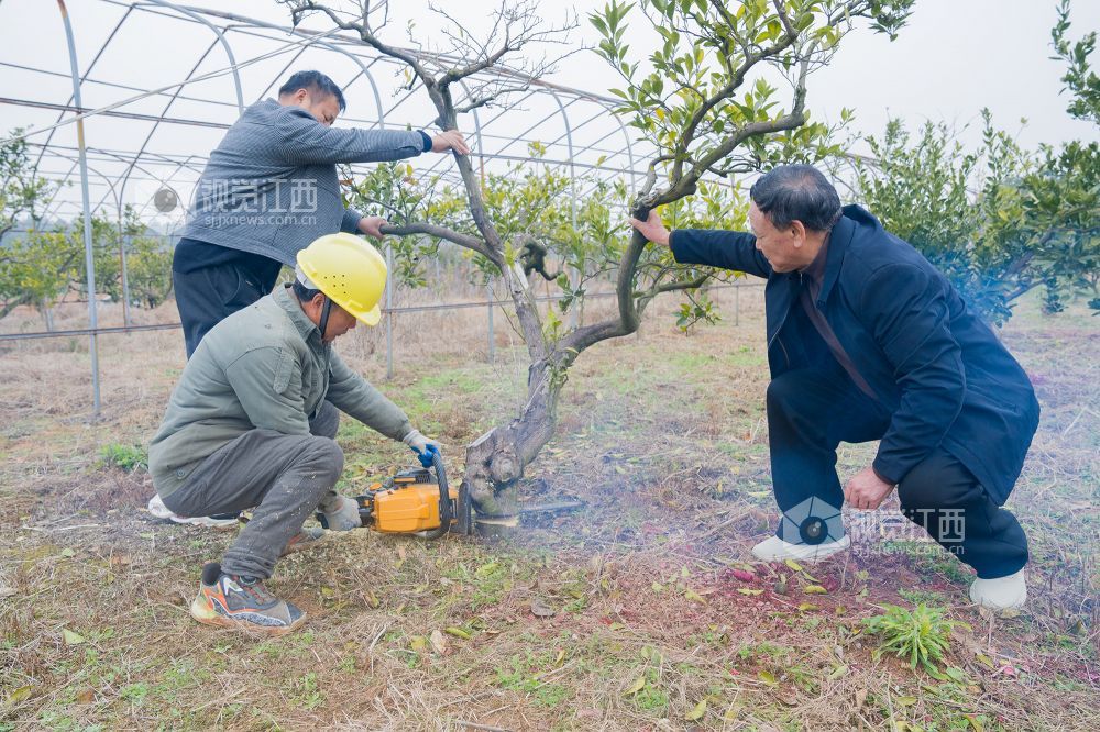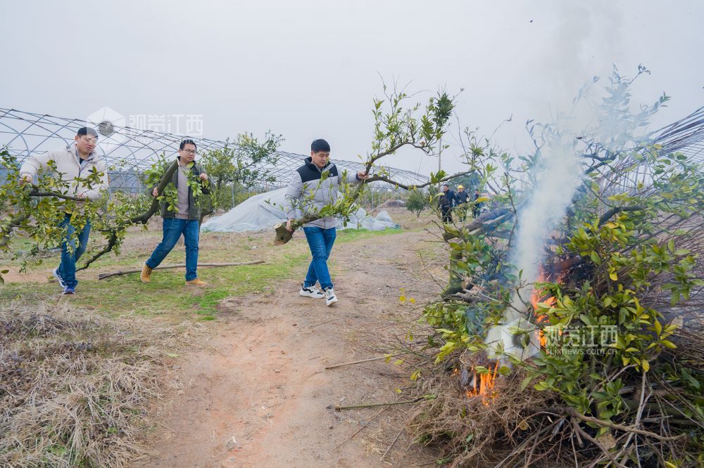 2025年2月25日,在江西省金溪县合市镇,镇村干部与果农在凤凰山村果园,在农技专家指导下对患有黄龙病的柑橘村进行标记、砍伐和销毁,防止病害扩散。
