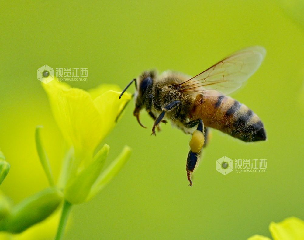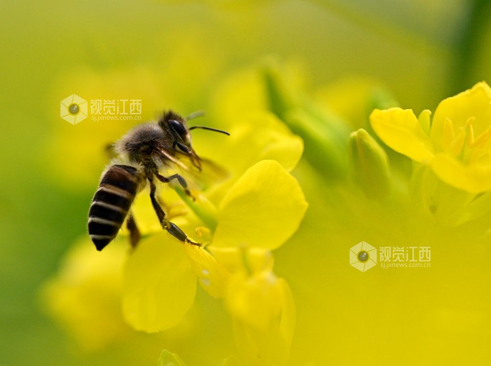 2025年3月2日,江西省上饶市铅山县汪二镇油菜花盛开,一只只蜜蜂在花丛中穿梭飞舞忙采蜜,风景美如画。