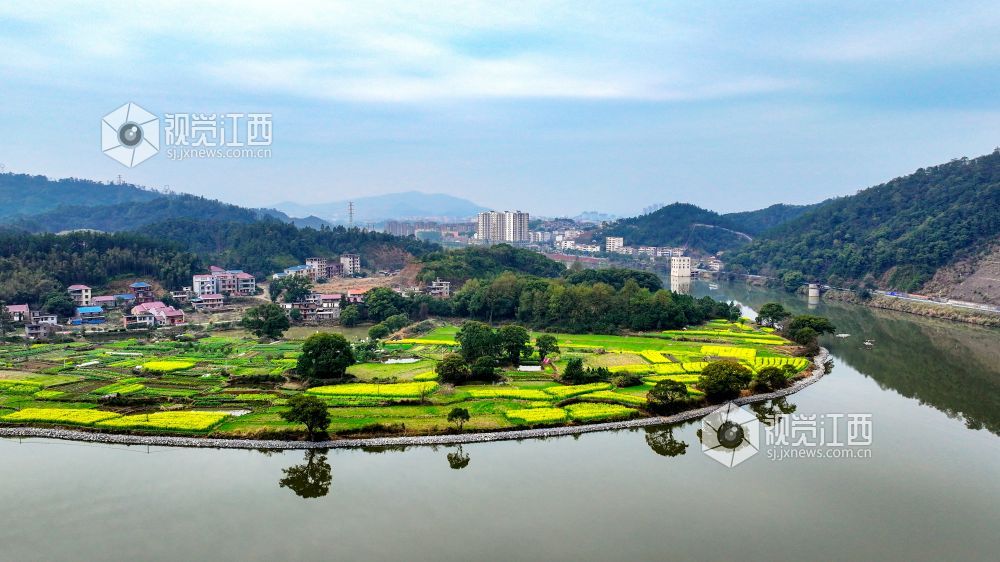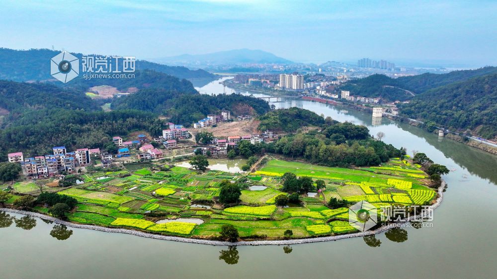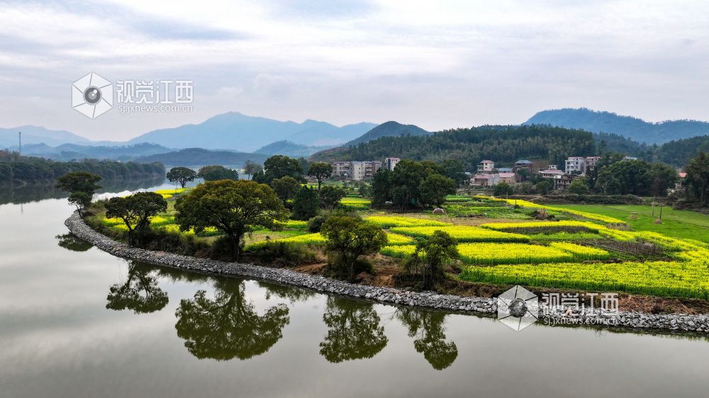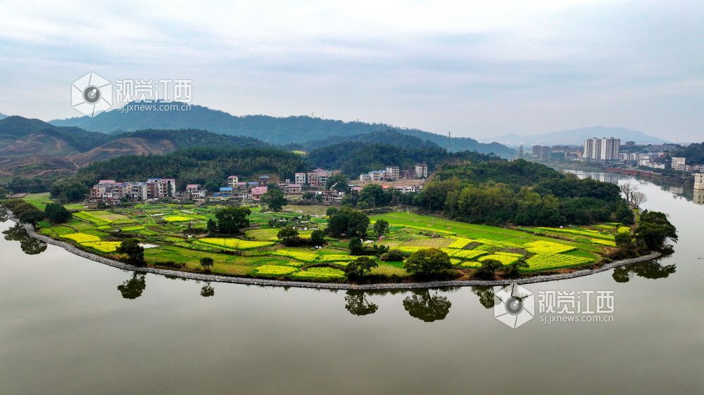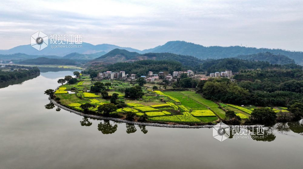 2025年3月9日,江西省吉安市吉水县文峰镇七里湾村,盛开的油菜花和秀美村庄相映成景,勾勒出生态宜居的和美乡村画卷。