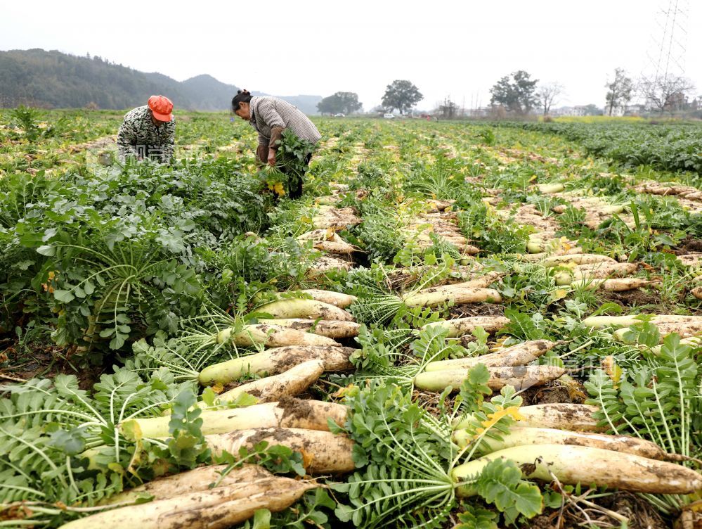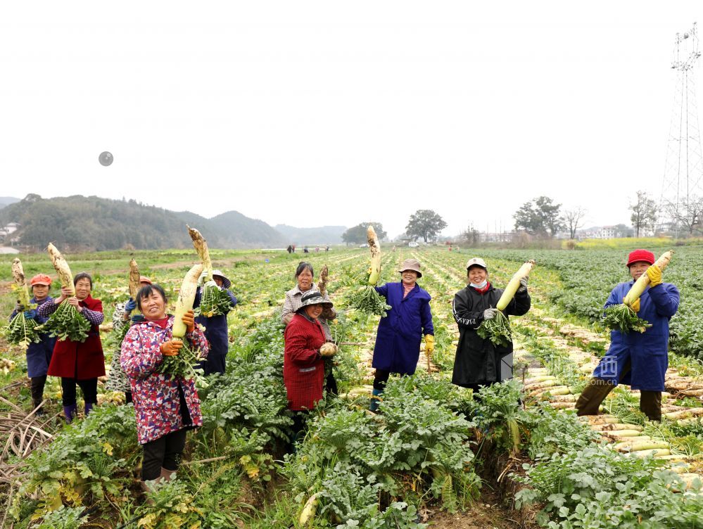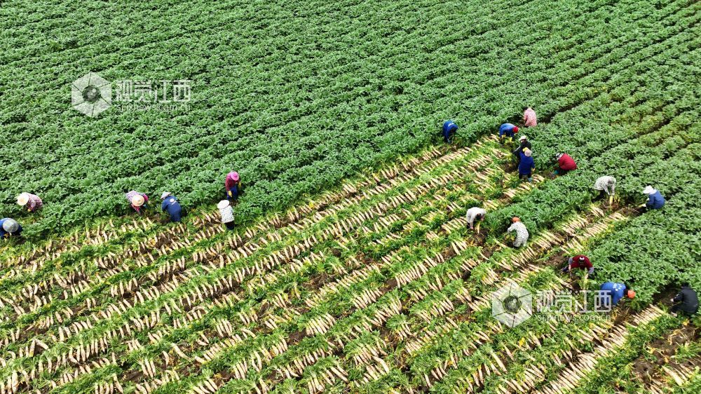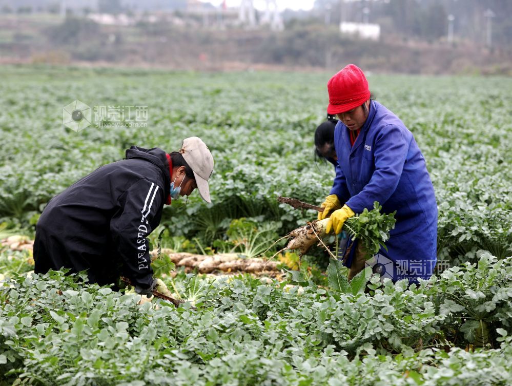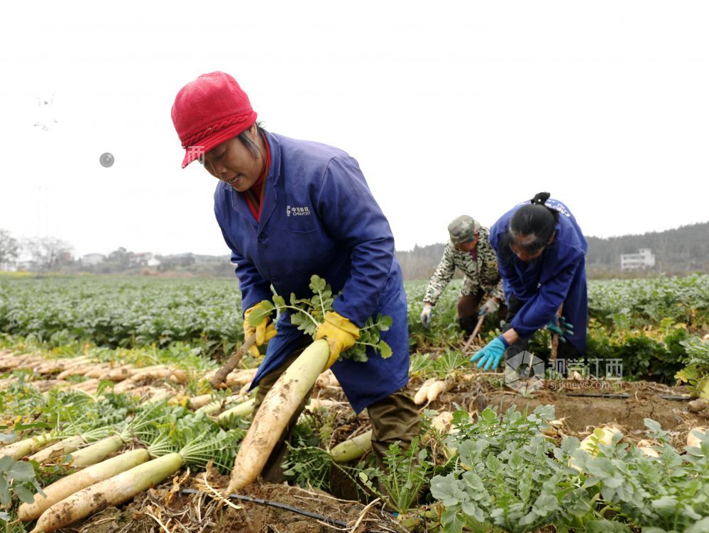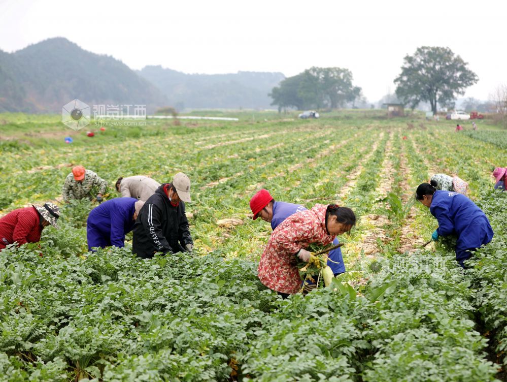 眼下,江西省分宜县洋江镇车田村300余亩萝卜迎来大丰收,田间地头“丰”景如画,基地负责人组织村民抢抓农时进行采收,准备运往山东、浙江等地农贸批发市场。