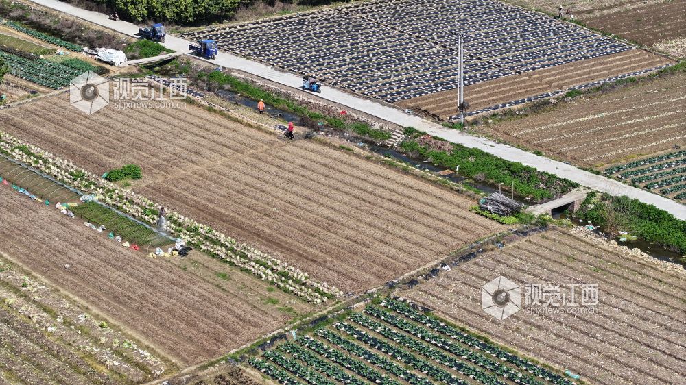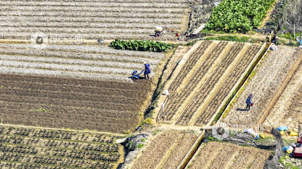村民们正在抢抓晴好天气在给菜地起垄、给菜秧洒水。