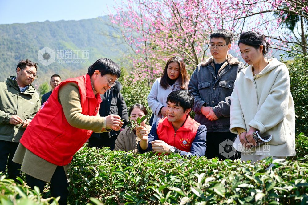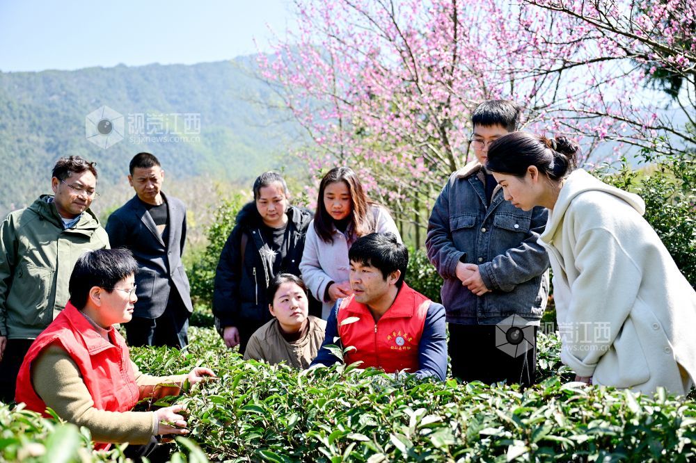 2025年3月21日,在江西省上饶市铅山县武夷山镇红茶科技小院实践教学点,茶学博士正在为茶农讲解生态茶园虫草害的防治。