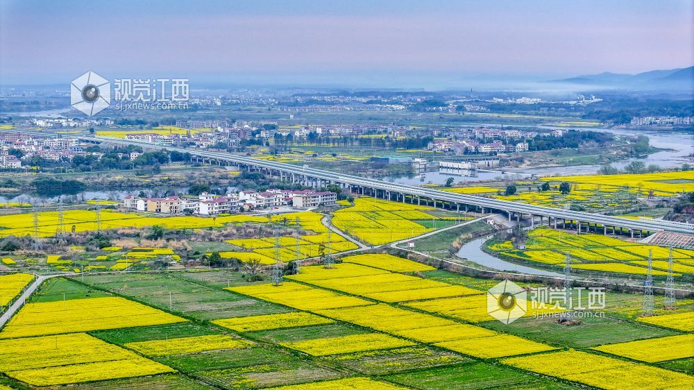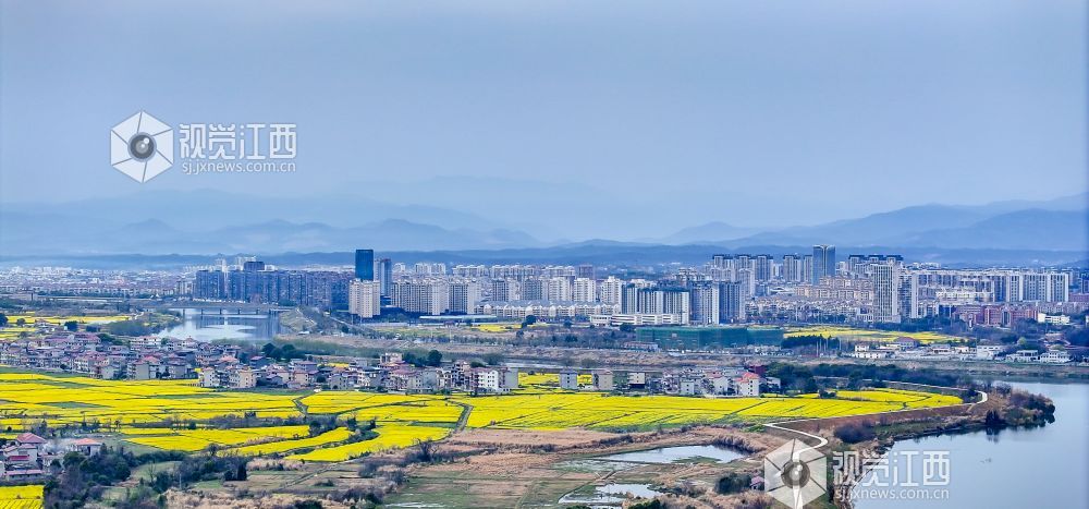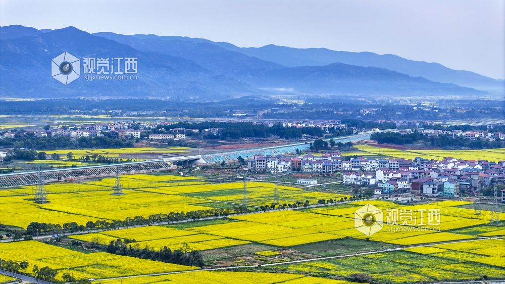3月23日,鸟瞰梅岭山脉西侧安义县城,远处连绵的群山巍峨耸立,城市和乡村都被团团簇簇的金色花海所拥抱,一个个秀美的村庄、一条条笔直的高速路网、一个个小溪河流,在金花烂漫的花海映衬下,犹如一幅色彩斑斓的山水画卷。