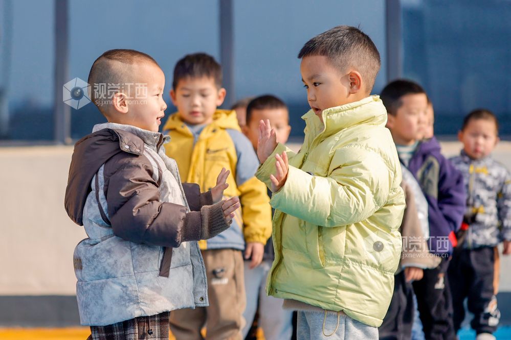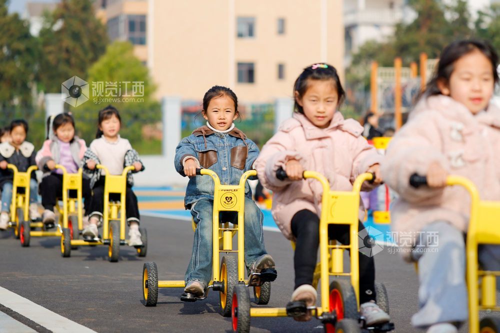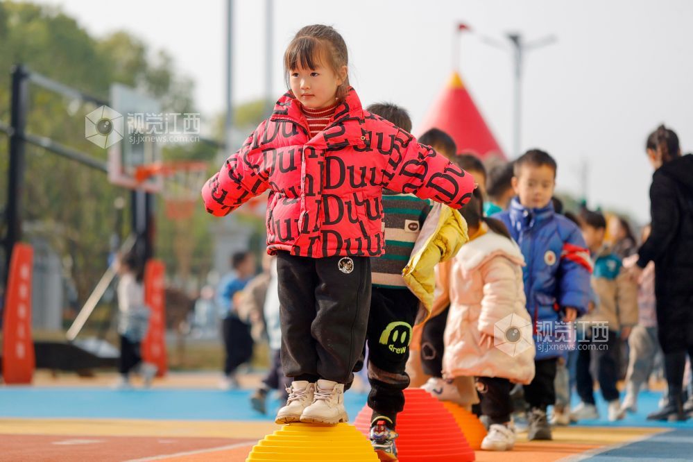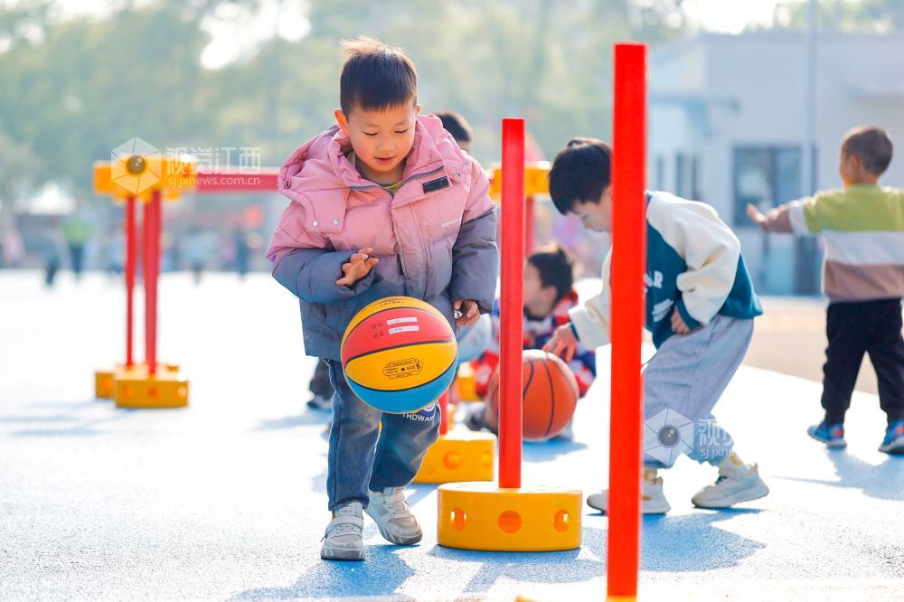 2025年4月1日,在江西省吉安市峡江县城西幼儿园大课间上,小朋友们在进行各类体育活动。