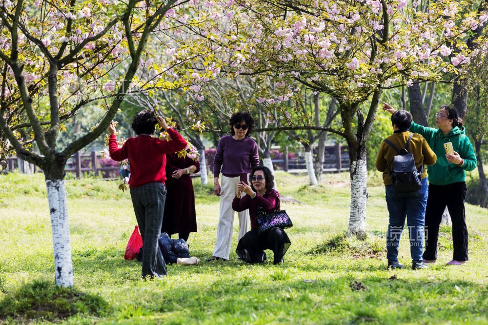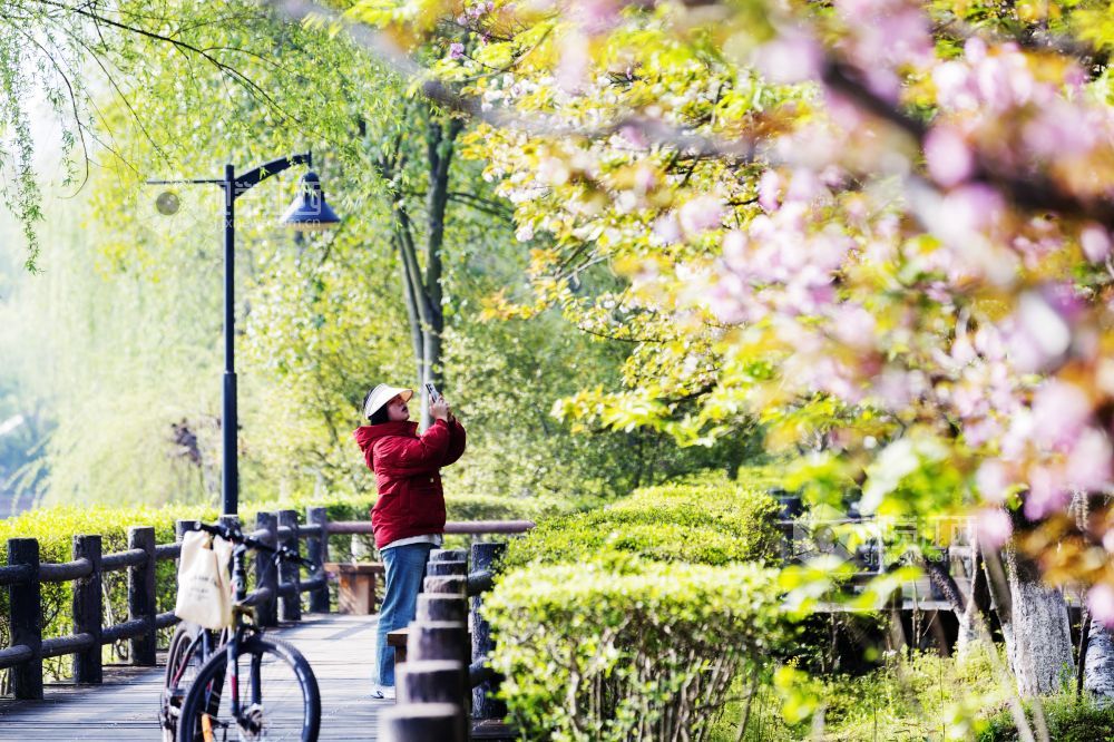 4月6日,江西省新余市孔目江国家湿地公园的樱花吸引了许多市民和游客前来观赏拍照,乐享春日美好时光。